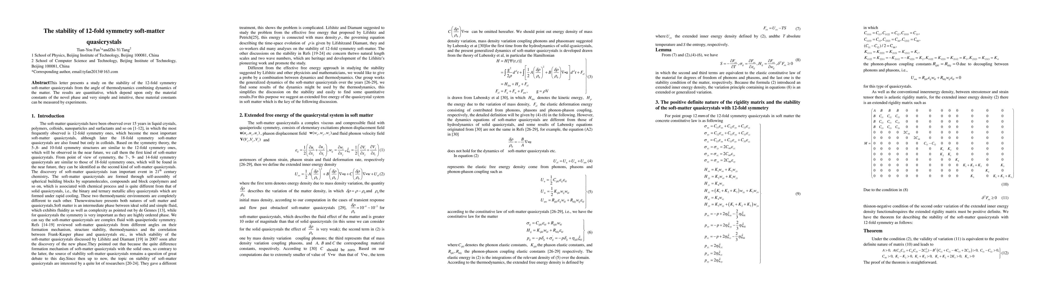This letter presents a study on the stability of the 12-fold symmetry soft-matter quasicrystals from the angle of thermodynamics combining dynamics of the matter. The results are quantitative, which depend upon only the material constants of the novel phase and very simple and intuitive, these material constants can be measured by experiments.