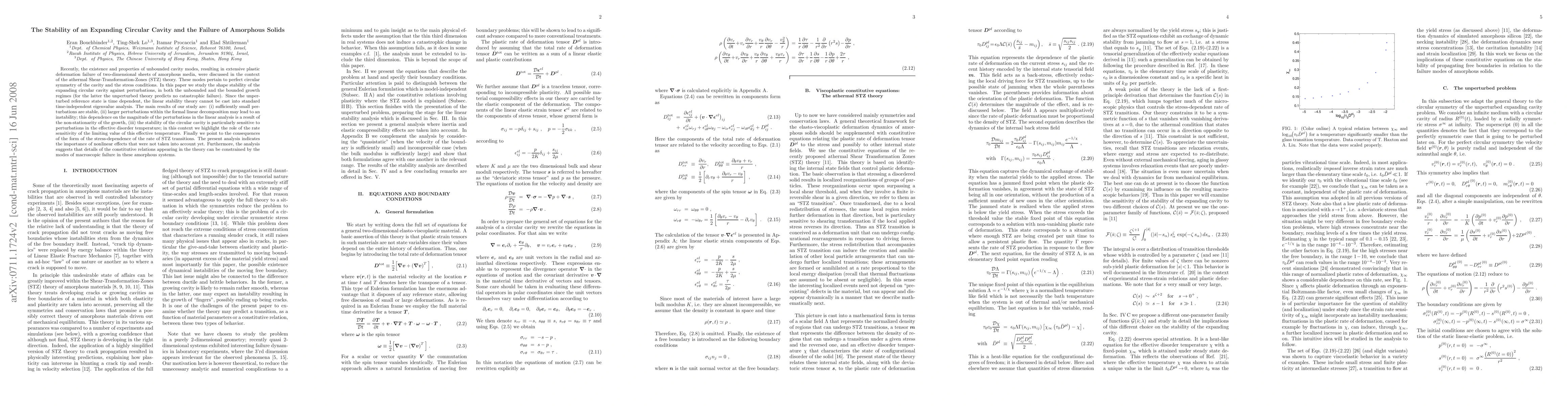 Recently, the existence and properties of unbounded cavity modes, resulting in extensive plastic deformation failure of two-dimensional sheets of amorphous media, were discussed in the context of the athermal Shear-Transformation-Zones (STZ) theory. These modes pertain to perfect circular symmetry of the cavity and the stress conditions. In this paper we study the shape stability of the expanding circular cavity against perturbations, in both the unbounded and the bounded growth regimes (for the latter the unperturbed theory predicts no catastrophic failure). Since the unperturbed reference state is time dependent, the linear stability theory cannot be cast into standard time-independent eigenvalue analysis. The main results of our study are: (i) sufficiently small perturbations are stable, (ii) larger perturbations within the formal linear decomposition may lead to an instability; this dependence on the magnitude of the perturbations in the linear analysis is a result of the non-stationarity of the growth, (iii) the stability of the circular cavity is particularly sensitive to perturbations in the effective disorder temperature; in this context we highlight the role of the rate sensitivity of the limiting value of this effective temperature. Finally we point to the importance of the form of the stress-dependence of the rate of STZ transitions. The present analysis indicates the importance of nonlinear effects that were not taken into account yet. Even more importantly, the analysis suggests that details of the constitutive relations appearing in the theory can be constrained by the modes of macroscopic failure in these amorphous systems.