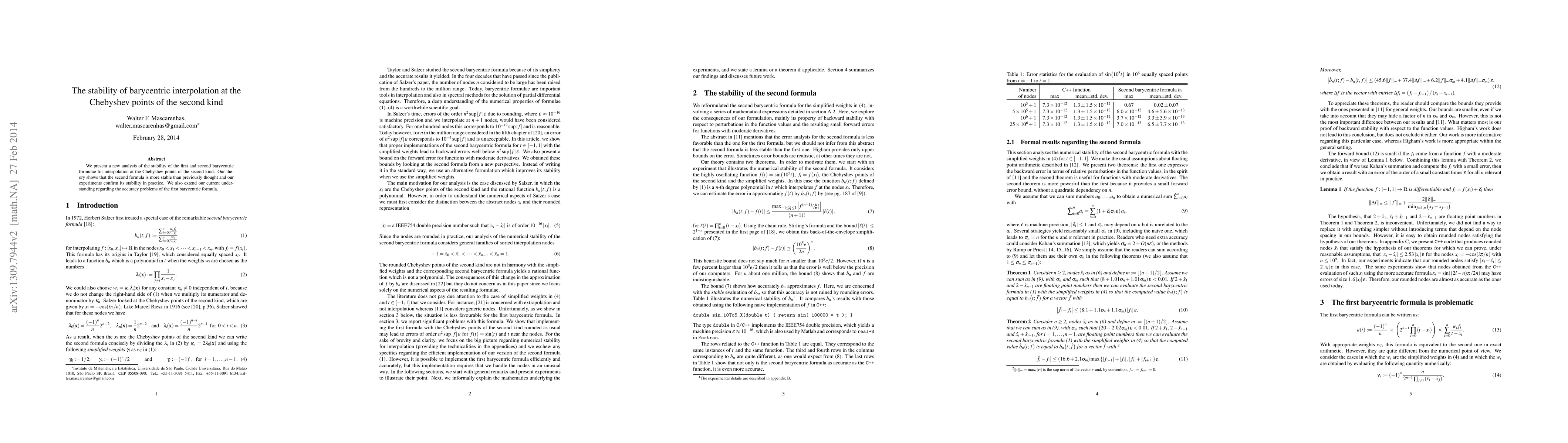 We present a new analysis of the stability of the first and second barycentric formulae for interpolation at the Chebyshev points of the second kind. Our theory shows that the second formula is more stable than previously thought and our experiments confirm its stability in practice. % OLD: We also explain that the first barycentric formula has accuracy problems which are not properly taken into account in the current literature. We also extend our current understanding regarding the accuracy problems of the first barycentric formula.