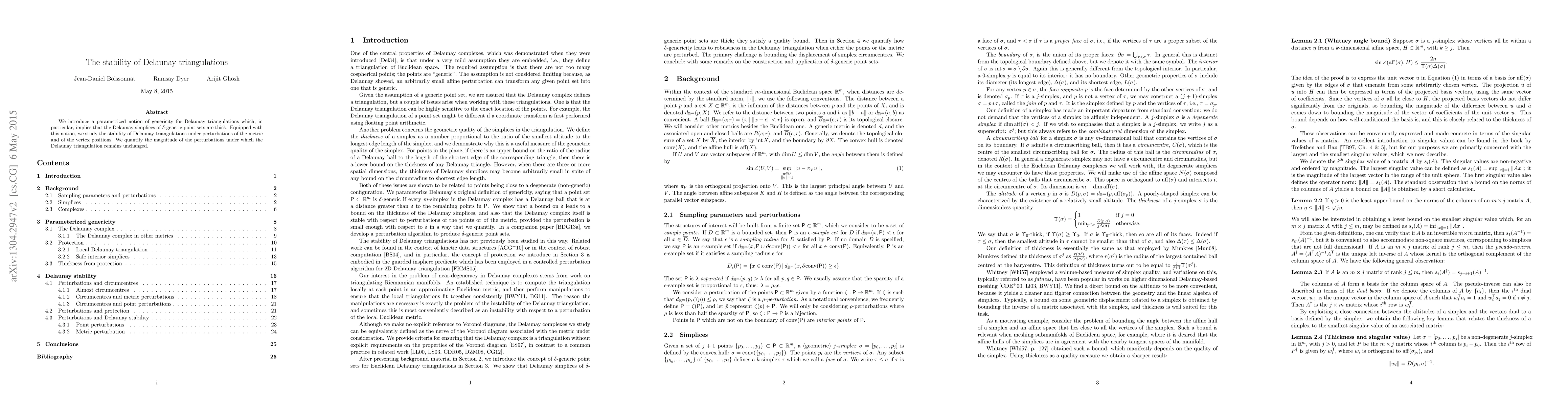 This paper introduces a parametrized notion of genericity for Delaunay triangulations, demonstrating that under such conditions, the resulting simplices are stable. It then investigates how these triangulations maintain their structure under metric and vertex perturbations.