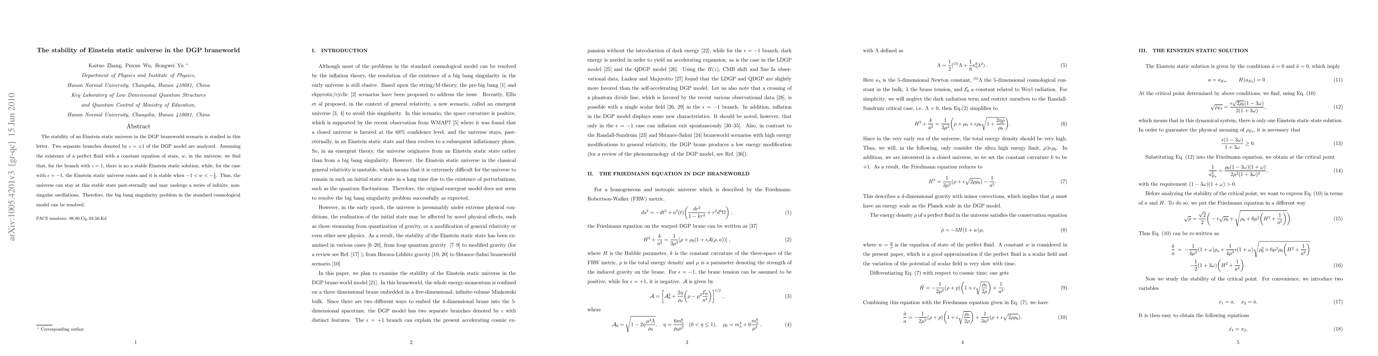 This paper investigates the stability of an Einstein static universe in the DGP braneworld model, finding no stable solution for $\epsilon=1$ but a stable, oscillating solution for $\epsilon=-1$ when $-1<w<-1/3$, potentially resolving the big bang singularity issue.