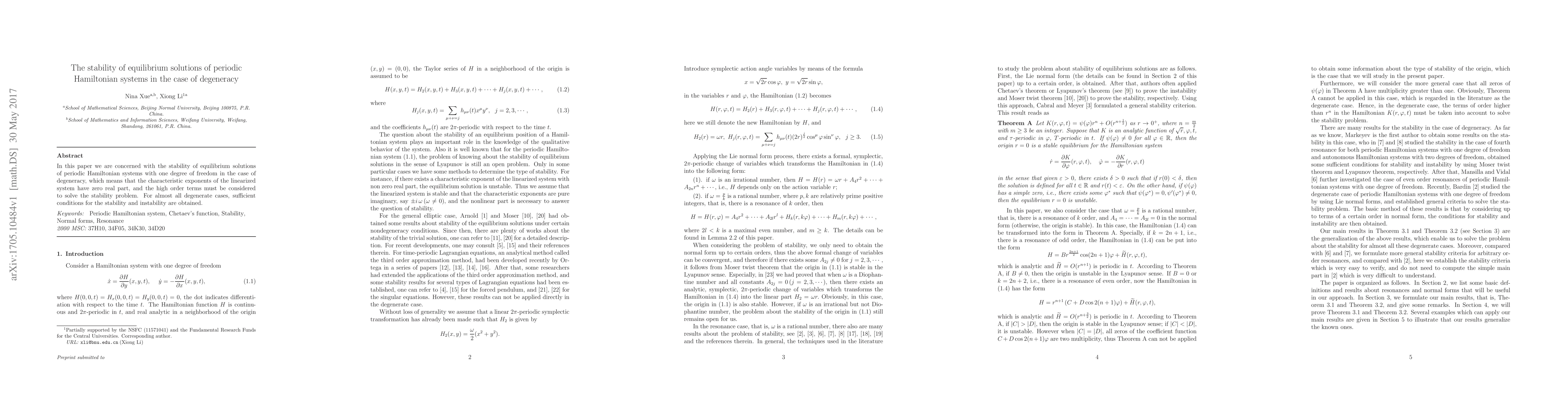 In this paper we are concerned with the stability of equilibrium solutions of periodic Hamiltonian systems with one degree of freedom in the case of degeneracy, which means that the characteristic exponents of the linearized system have zero real part, and the high order terms must be considered to solve the stability problem. For almost all degenerate cases, sufficient conditions for the stability and instability are obtained.