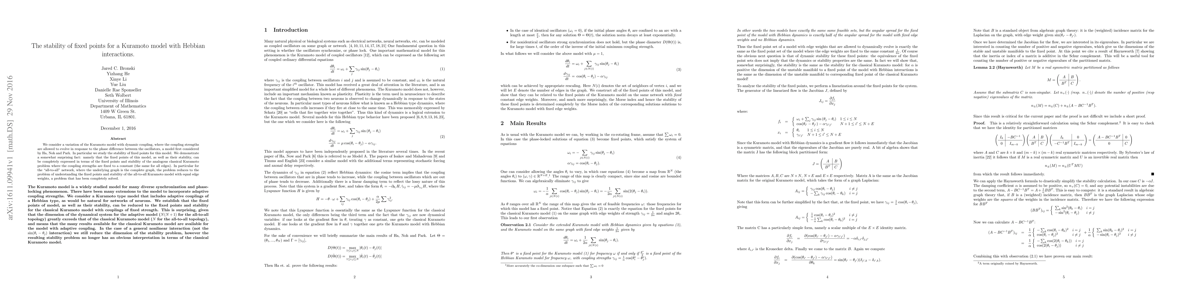 The stability of fixed points in a Kuramoto model with Hebbian interactions is shown to be equivalent to the analogous classical Kuramoto problem, reducing it to a solved subproblem.