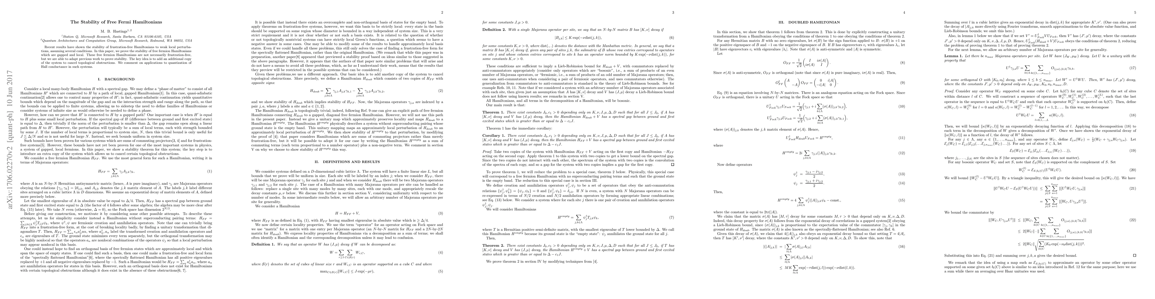 Recent results have shown the stability of frustration-free Hamiltonians to weak local perturbations, assuming several conditions. In this paper, we prove the stability of free fermion Hamiltonians which are gapped and local. These free fermion Hamiltonians are not necessarily frustration-free, but we are able to adapt previous work to prove stability. The key idea is to add an additional copy of the system to cancel topological obstructions. We comment on applications to quantization of Hall conductance in such systems.