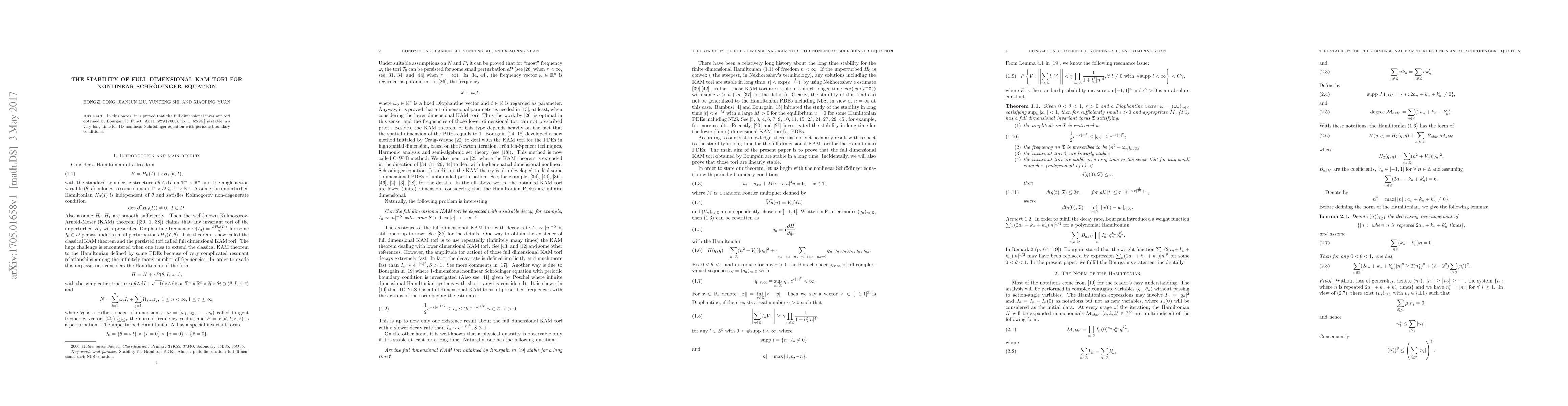 This paper proves the long-term stability of full dimensional invariant tori for the 1D nonlinear Schrödinger equation under periodic boundary conditions, extending the results of Bourgain (2005).