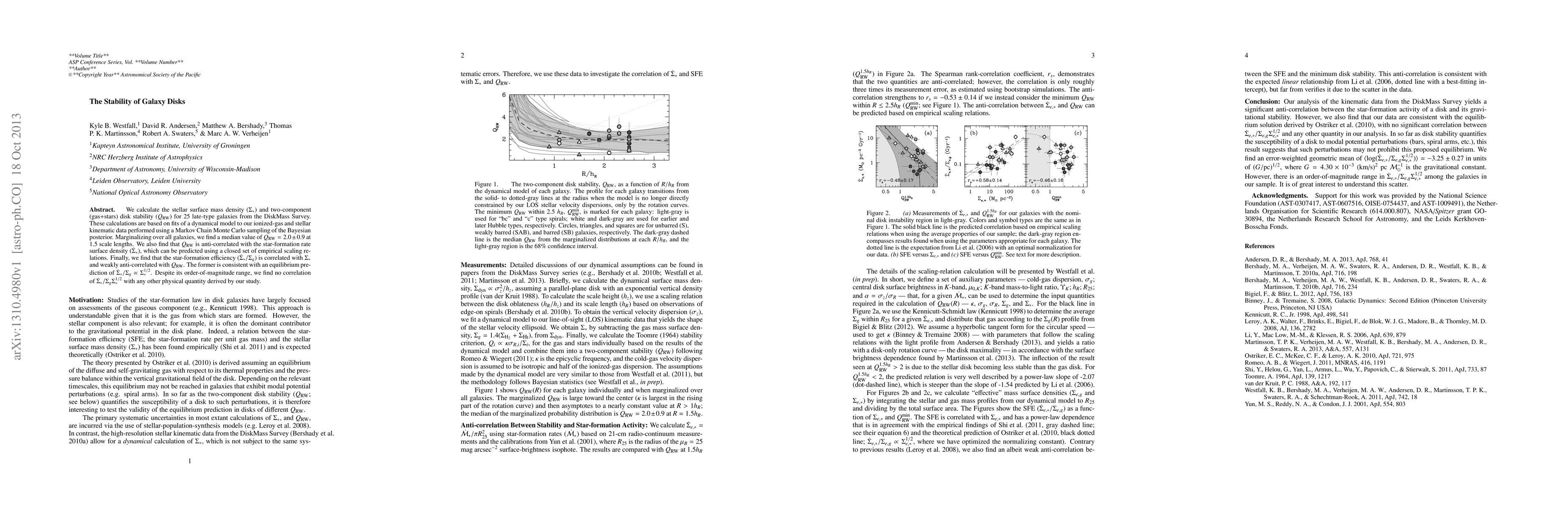 We calculate the stellar surface mass density (Sigma_*) and two-component (gas+stars) disk stability (Q_RW) for 25 late-type galaxies from the DiskMass Survey. These calculations are based on fits of a dynamical model to our ionized-gas and stellar kinematic data performed using a Markov Chain Monte Carlo sampling of the Bayesian posterior. Marginalizing over all galaxies, we find a median value of Q_RW=2.0+/-0.9 at 1.5 scale lengths. We also find that Q_RW is anti-correlated with the star-formation rate surface density (Sigma_SFR), which can be predicted using a closed set of empirical scaling relations. Finally, we find that the star-formation efficiency (Sigma_SFR/Sigma_g) is correlated with Sigma_* and weakly anti-correlated with Q_RW. The former is consistent with an equilibrium prediction of Sigma_SFR/Sigma_g propto Sigma_*^{1/2}. Despite its order-of-magnitude range, we find no correlation of Sigma_SFR/Sigma_g/Sigma_*^{1/2} with any other physical quantity derived by our study.