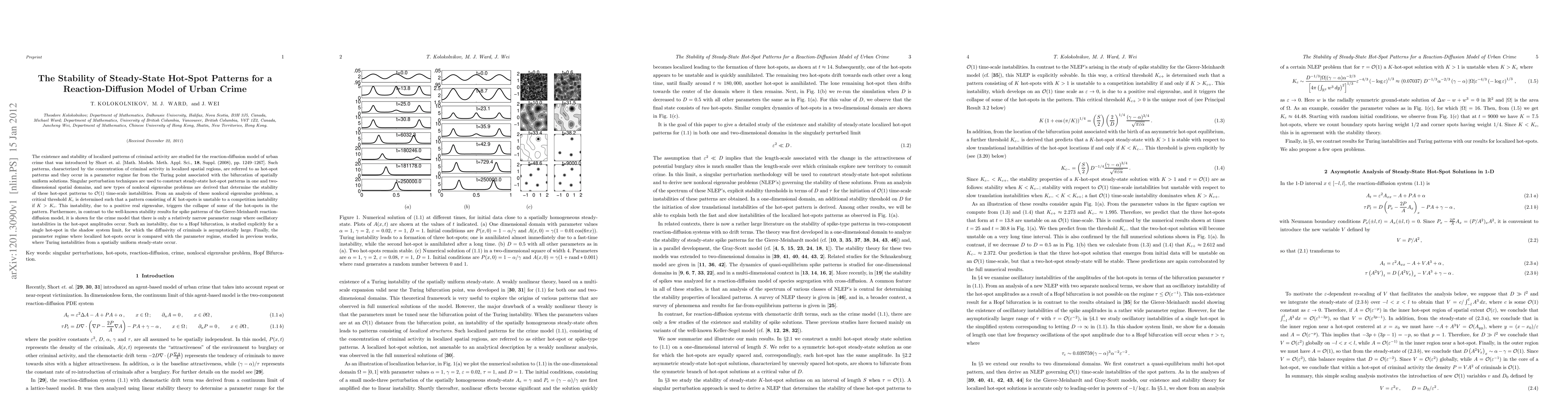 The existence and stability of localized patterns of criminal activity are studied for the reaction-diffusion model of urban crime that was introduced by Short et. al. [Math. Models. Meth. Appl. Sci., 18, Suppl. (2008), pp. 1249--1267]. Such patterns, characterized by the concentration of criminal activity in localized spatial regions, are referred to as hot-spot patterns and they occur in a parameter regime far from the Turing point associated with the bifurcation of spatially uniform solutions. Singular perturbation techniques are used to construct steady-state hot-spot patterns in one and two-dimensional spatial domains, and new types of nonlocal eigenvalue problems are derived that determine the stability of these hot-spot patterns to ${\mathcal O}(1)$ time-scale instabilities. From an analysis of these nonlocal eigenvalue problems, a critical threshold $K_c$ is determined such that a pattern consisting of $K$ hot-spots is unstable to a competition instability if $K>K_c$. This instability, due to a positive real eigenvalue, triggers the collapse of some of the hot-spots in the pattern. Furthermore, in contrast to the well-known stability results for spike patterns of the Gierer-Meinhardt reaction-diffusion model, it is shown for the crime model that there is only a relatively narrow parameter range where oscillatory instabilities in the hot-spot amplitudes occur. Such an instability, due to a Hopf bifurcation, is studied explicitly for a single hot-spot in the shadow system limit, for which the diffusivity of criminals is asymptotically large. Finally, the parameter regime where localized hot-spots occur is compared with the parameter regime, studied in previous works, where Turing instabilities from a spatially uniform steady-state occur.