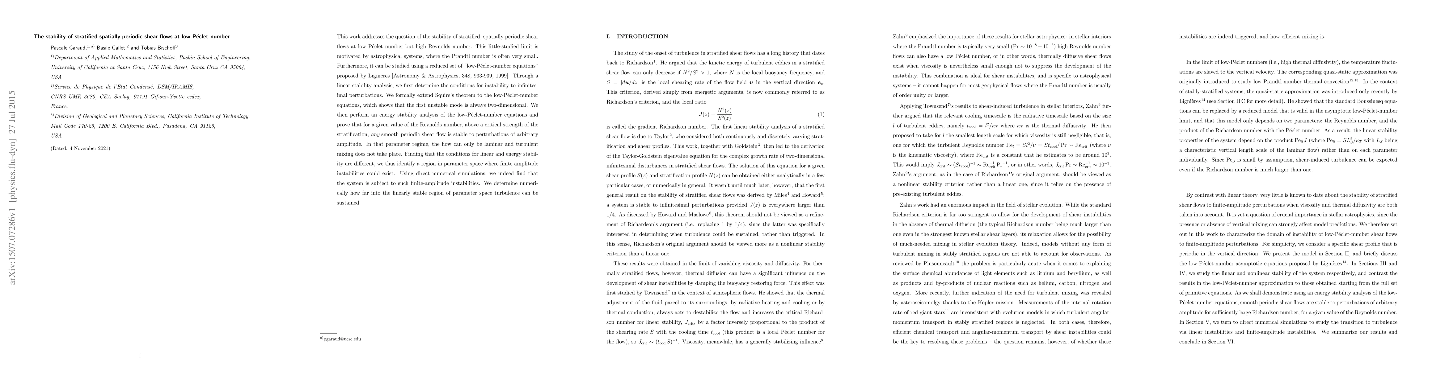 This paper investigates the stability of stratified, spatially periodic shear flows at low P\'eclet number, revealing that linear and energy stability conditions differ. It finds that while infinitesimal perturbations lead to two-dimensional instabilities, sufficiently strong stratification can stabilize flows against larger perturbations, preventing turbulent mixing.
