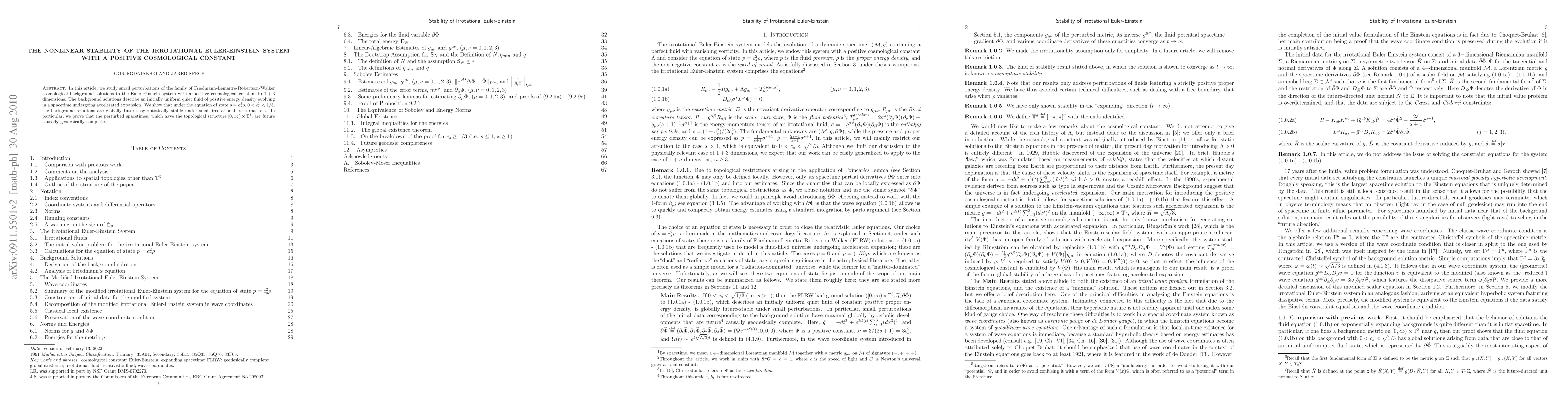 This paper investigates the stability of Friedmann-Lemaître-Robertson-Walker solutions in the Euler-Einstein system with a positive cosmological constant, showing they are globally asymptotically stable under small irrotational perturbations and remain causally geodesically complete.