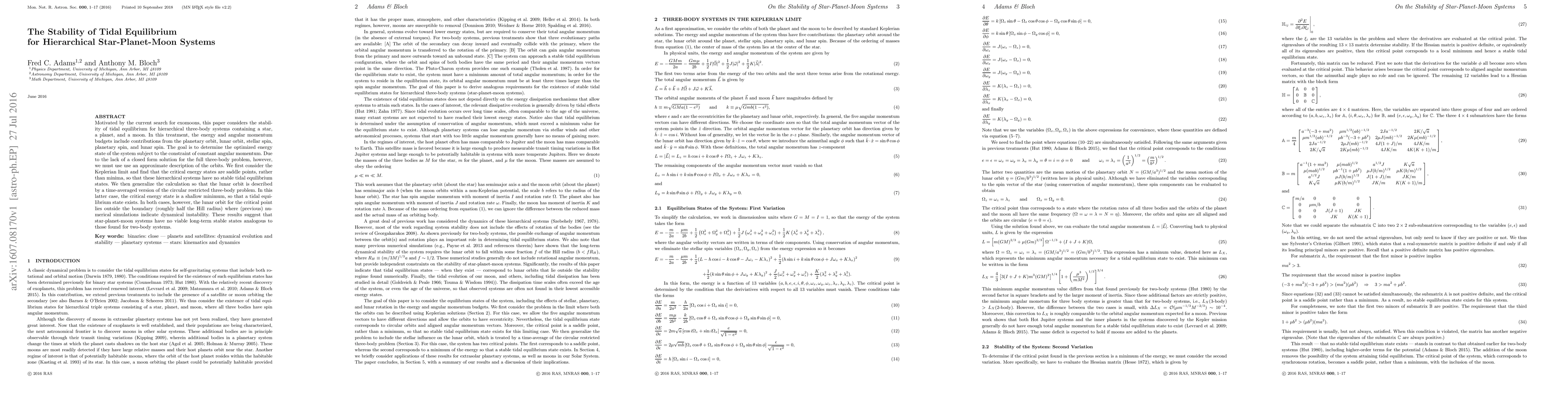 This paper investigates the stability of tidal equilibrium in hierarchical star-planet-moon systems, finding that no stable tidal equilibrium states exist due to the lack of minima in energy states. While a shallow minimum exists under a generalized model, the lunar orbit remains dynamically unstable.