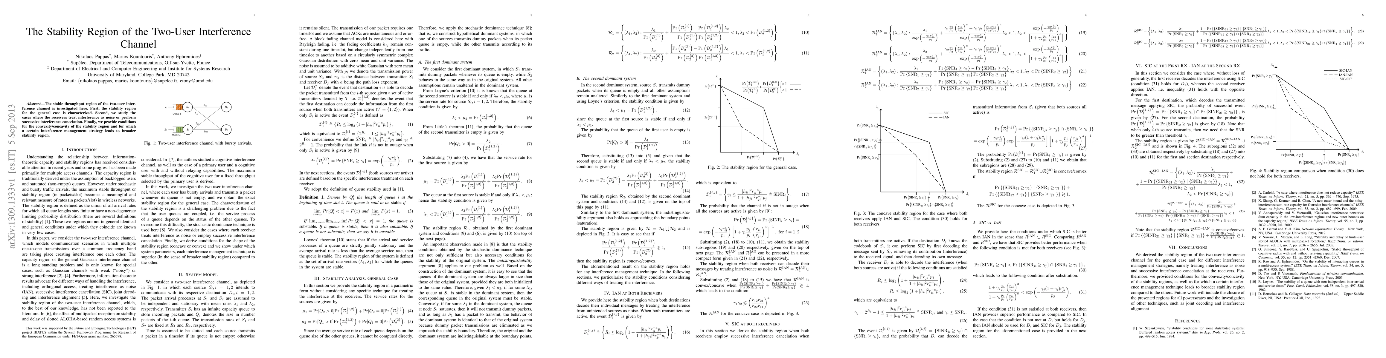 The stable throughput region of the two-user interference channel is investigated here. First, the stability region for the general case is characterized. Second, we study the cases where the receivers treat interference as noise or perform successive interference cancelation. Finally, we provide conditions for the convexity/concavity of the stability region and for which a certain interference management strategy leads to broader stability region.