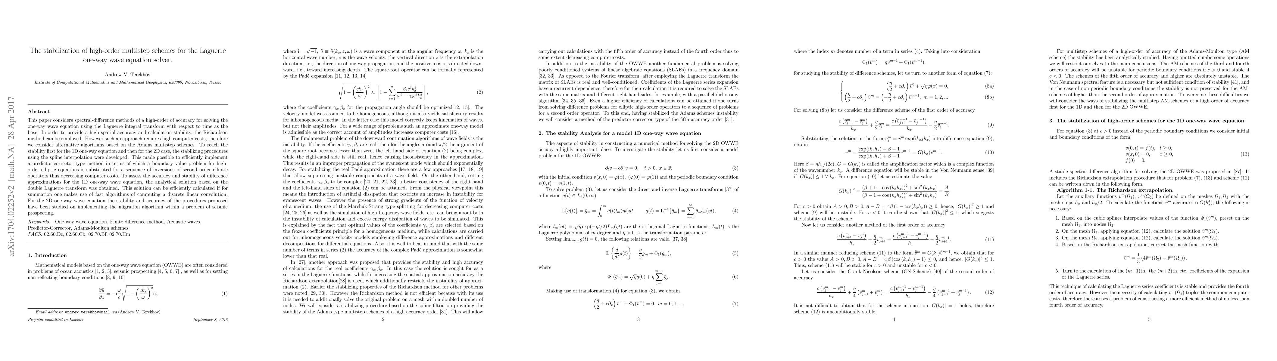 This paper considers spectral-difference methods of a high-order of accuracy for solving the one-way wave equation using the Laguerre integral transform with respect to time as the base. In order to provide a high spatial accuracy and calculation stability, the Richardson method can be employed. However such an approach requires high computer costs, therefore we consider alternative algorithms based on the Adams multistep schemes. To reach the stability first for the 1D one-way equation and then for the 2D case, the stabilizing procedures using the spline interpolation were developed. This made possible to efficiently implement a predictor-corrector type method in terms of which a boundary value problem for high-order elliptic equations is substituted for a sequence of inversions of second order elliptic operators thus decreasing computer costs. To assess the accuracy and stability of difference approximations for the 1D one-way wave equation, the analytical solution based on the double Laguerre transform was obtained. This solution can be efficiently calculated if for summation one makes use of fast algorithms of computing a discrete linear convolution. For the 2D one-way wave equation the stability and accuracy of the procedures proposed have been studied on implementing the migration algorithm within a problem of seismic prospecting.