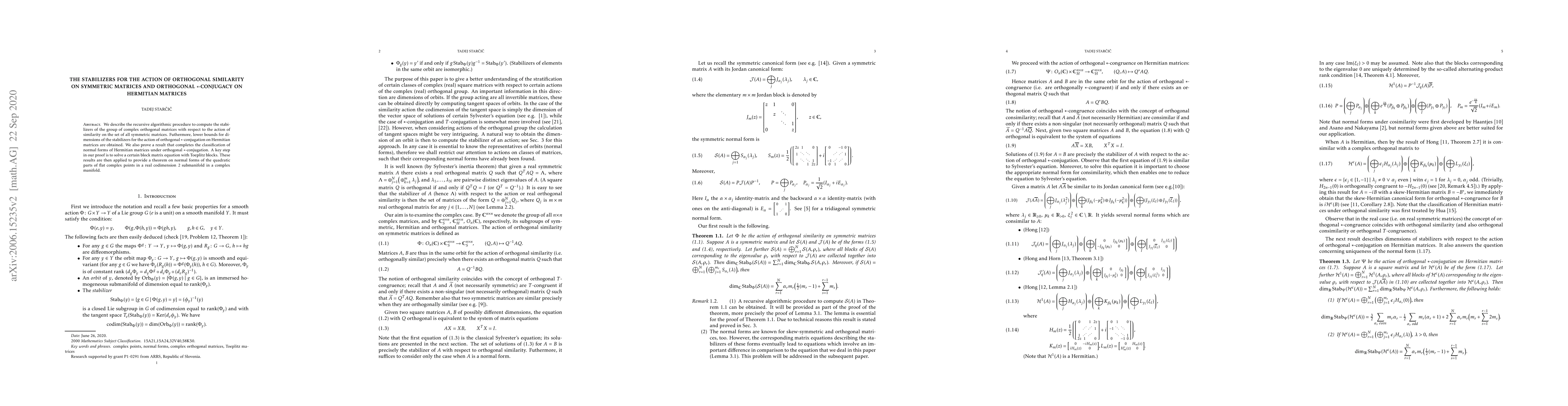 This paper presents an algorithmic method to compute stabilizers for the action of orthogonal similarity on symmetric matrices and provides lower bounds for the dimensions of stabilizers for orthogonal $*$-conjugation on Hermitian matrices. It also completes the classification of normal forms of Hermitian matrices under orthogonal $*$-conjugation and applies these results to study the normal forms of quadratic parts of flat complex points in a real codimension 2 submanifold.