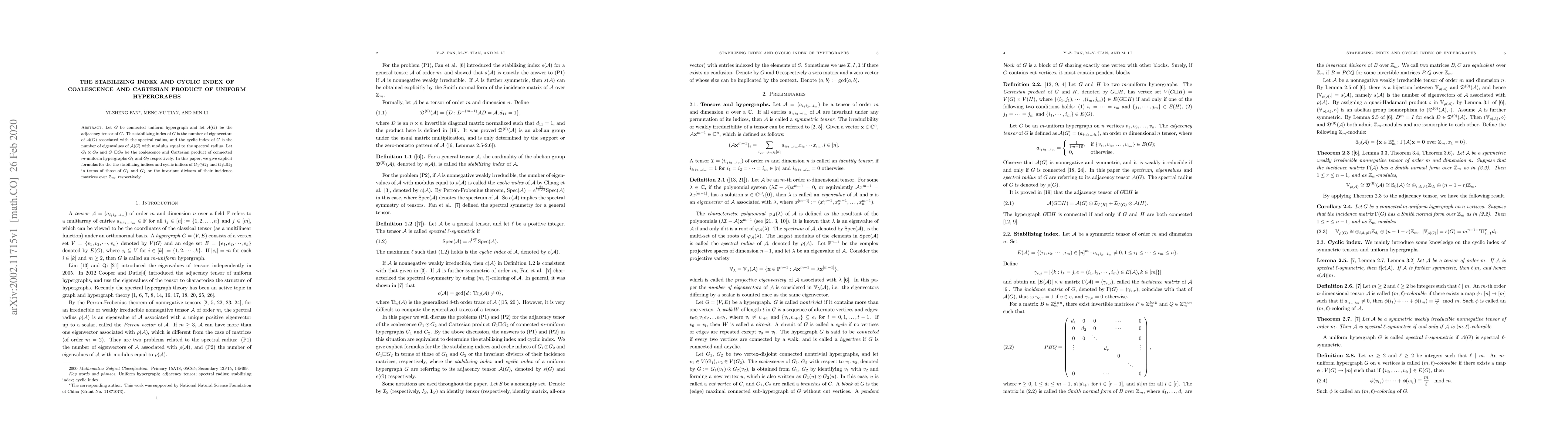 Let $G$ be connected uniform hypergraph and let $\mathcal{A}(G)$ be the adjacency tensor of $G$. The stabilizing index of $G$ is the number of eigenvectors of $\mathcal{A}(G)$ associated with the spectral radius, and the cyclic index of $G$ is the number of eigenvalues of $\mathcal{A}(G)$ with modulus equal to the spectral radius. Let $G_1 \odot G_2$ and $G_1 \Box G_2$ be the coalescence and Cartesian product of connected $m$-uniform hypergraphs $G_1$ and $G_2$ respectively. In this paper, we give explicit formulas for the the stabilizing indices and cyclic indices of $G_1 \odot G_2$ and $G_1 \Box G_2$ in terms of those of $G_1$ and $G_2$ or the invariant divisors of their incidence matrices over $\mathbb{Z}_m$, respectively.