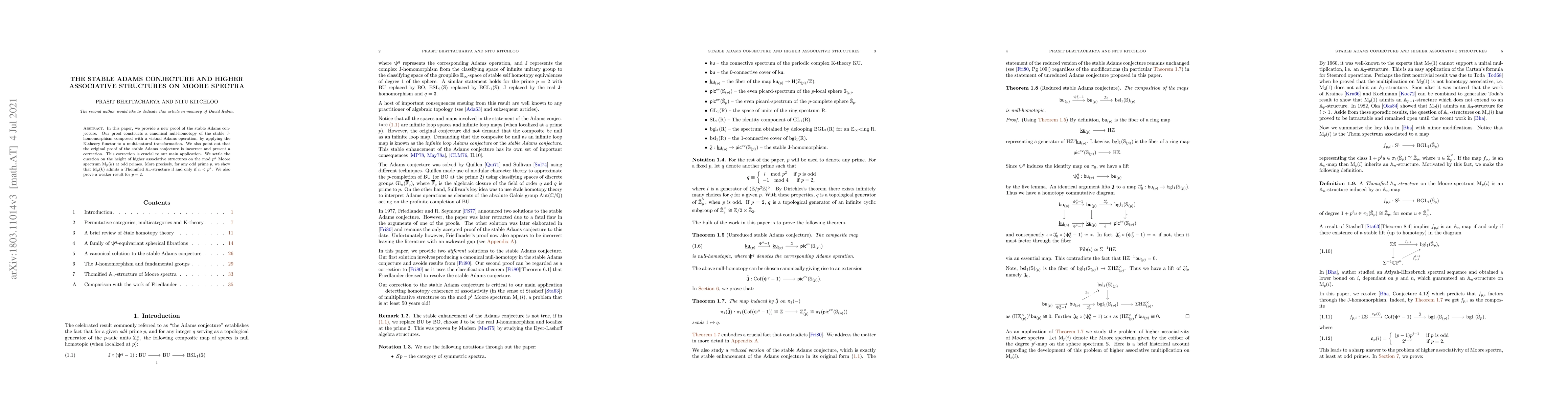 This paper proves the stable Adams conjecture using a new proof method and establishes conditions for higher associative structures on Moore spectra, shedding light on their properties at odd primes.