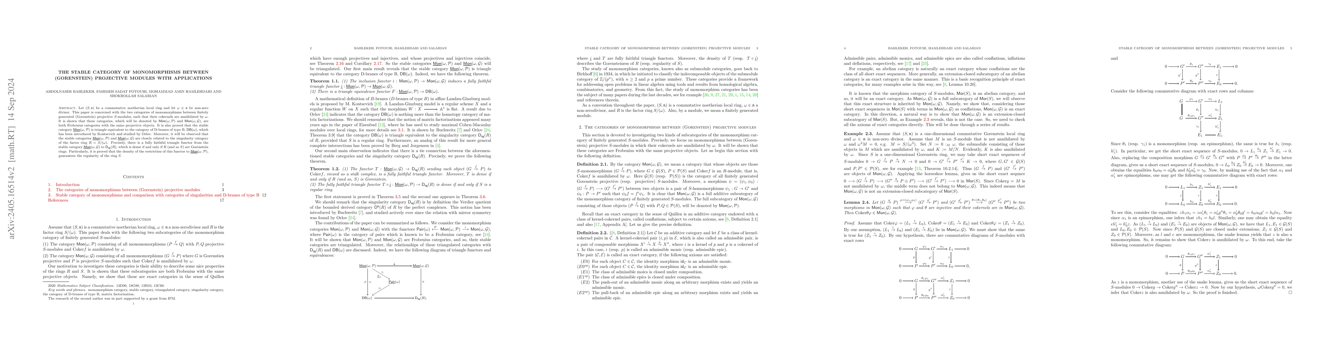 Let (S; n) be a commutative noetherian local ring and let w in n be non-zero divisor. This paper is concerned with the two categories of monomorphisms between finitely generated (Gorenstein) projective S-modules, such that their cokernels are annihilated by w. It is shown that these categories, which will be denoted by Mon(w;P) and Mon(w; G), are both Frobenius categories with the same projective objects. It is also proved that the stable category Mon(w;P) is triangle equivalent to the category of D-branes of type B, DB(w), which has been introduced by Kontsevich and studied by Orlov. Moreover, it will be observed that the stable categories Mon(w;P) and Mon(w; G) are closely related to the singularity category of the factor ring R = S=(w). Precisely, there is a fully faithful triangle functor from the stable category Mon(w; G) to Dsg(R), which is dense if and only if R (and so S) are Gorenstein rings. Particularly, it is proved that the density of the restriction of this functor to Mon(w;P), guarantees the regularity of the ring S.
