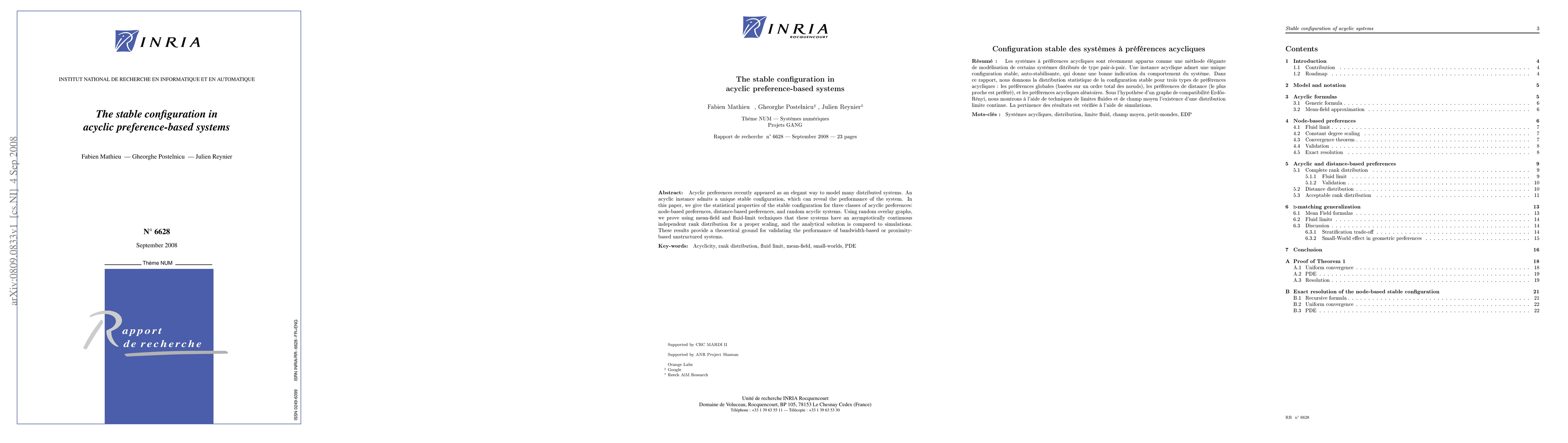 This paper investigates the stable configuration of acyclic preference-based systems, identifying unique stable configurations that reflect system performance. It analyzes the statistical properties of stable configurations for node-based, distance-based, and random acyclic preferences, proving an asymptotically continuous independent rank distribution using mean-field and fluid-limit techniques.