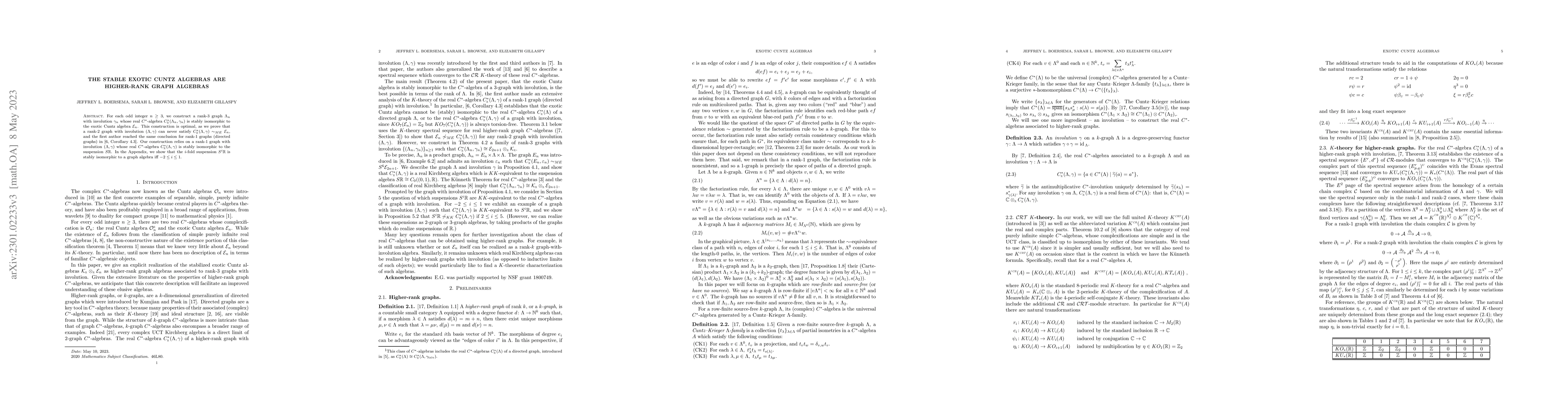 For each odd integer $n \geq 3$, we construct a rank-3 graph $\Lambda_n$ with involution $\gamma_n$ whose real C*-algebra $C^*_\mathbb{R}(\Lambda_n, \gamma_n)$ is stably isomorphic to the exotic Cuntz algebra $\mathcal E_n^\mathbb{R}$. This construction is optimal, as we prove that a rank-2 graph with involution $(\Lambda,\gamma)$ can never satisfy $C^*_\mathbb{R}(\Lambda, \gamma)\sim_{ME} \mathcal E_n^\mathbb{R}$, and the first author reached the same conclusion in previous work. Our construction relies on a rank-1 graph with involution $(\Lambda, \gamma)$ whose real C*-algebra $C^*_\mathbb{R}(\Lambda, \gamma)$ is stably isomorphic to the suspension $ S \mathbb{R}$. In the Appendix, we show that the i-fold suspension $S^i \mathbb{R}$ is stably isomorphic to a graph algebra iff $-2 \leq i \leq 1$.