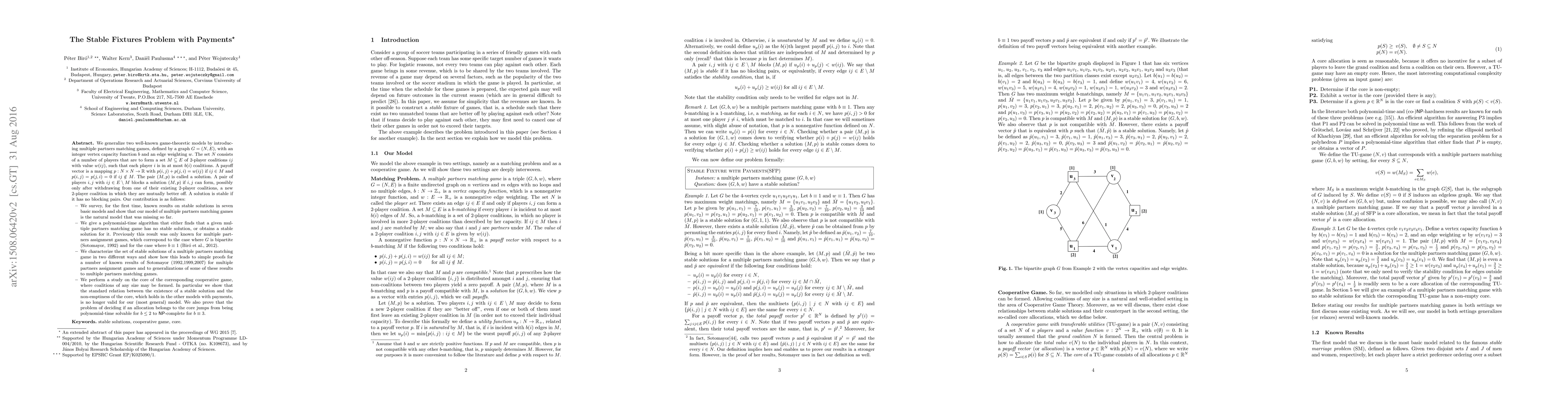 We generalize two well-known game-theoretic models by introducing multiple partners matching games, defined by a graph $G=(N,E)$, with an integer vertex capacity function $b$ and an edge weighting $w$. The set $N$ consists of a number of players that are to form a set $M\subseteq E$ of 2-player coalitions $ij$ with value $w(ij)$, such that each player $i$ is in at most $b(i)$ coalitions. A payoff vector is a mapping $p: N \times N \rightarrow {\mathbb R}$ with $p(i,j)+p(j,i)=w(ij)$ if $ij\in M$ and $p(i,j)=p(j,i)=0$ if $ij\notin M$. The pair $(M,p)$ is called a solution. A pair of players $i,j$ with $ij\in E\setminus M$ blocks a solution $(M,p)$ if $i,j$ can form, possibly only after withdrawing from one of their existing 2-player coalitions, a new 2-player coalition in which they are mutually better off. A solution is stable if it has no blocking pairs. We give a polynomial-time algorithm that either finds that a given multiple partners matching game has no stable solution, or obtains a stable solution for it. We characterize the set of stable solutions of a multiple partners matching game in two different ways and show how this leads to simple proofs for a number of known results of Sotomayor (1992,1999,2007) for multiple partners ssignment games and to generalizations of some of these results to multiple partners matching games. We also perform a study on the core of the corresponding cooperative game, where coalitions of any size may be formed. In particular we show that the standard relation between the existence of a stable solution and the non-emptiness of the core, which holds in the other models with payments, is no longer valid for our (most general) model. We also prove that the problem of deciding if an allocation belongs to the core jumps from being polynomial-time solvable for $b\leq 2$ to NP-complete for $b\equiv 3$.