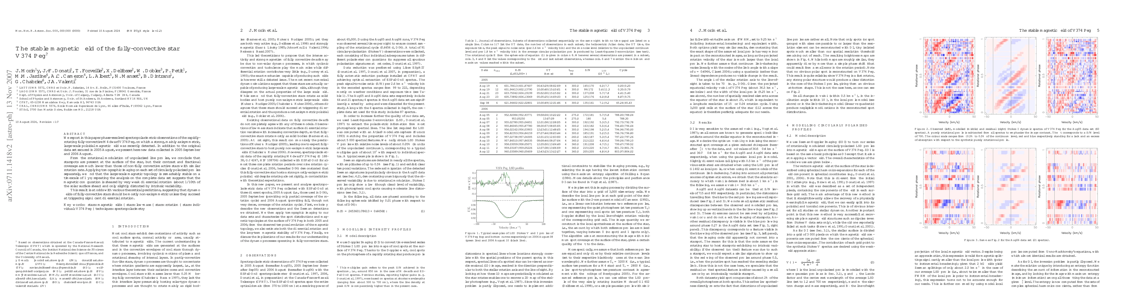 This paper reports on phase-resolved spectropolarimetric observations of the M4 dwarf V374 Peg, revealing a stable, mainly axisymmetric large-scale magnetic field despite the star's rapid rotation. The study finds that starspots are present but less prominent compared to non-fully convective stars, and the magnetic topology remains stable over a year, contradicting theoretical predictions of non-axisymmetric dynamo fields in fully convective stars.