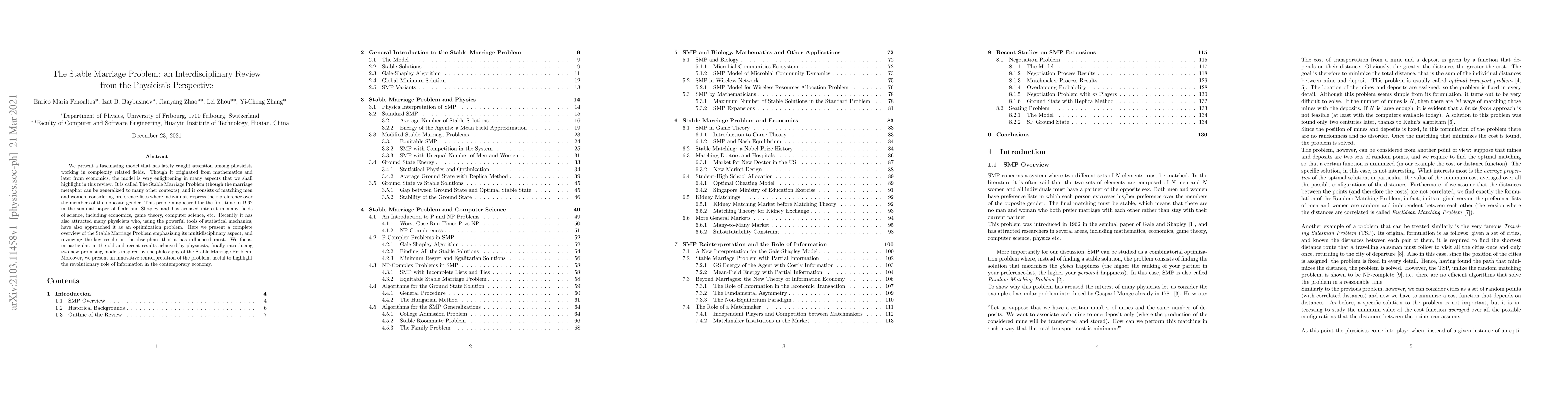 This paper reviews the Stable Marriage Problem from a physicist's perspective, highlighting its interdisciplinary appeal and recent applications in complexity theory and optimization. It emphasizes the problem's historical roots in mathematics and economics, and introduces new models inspired by its principles.