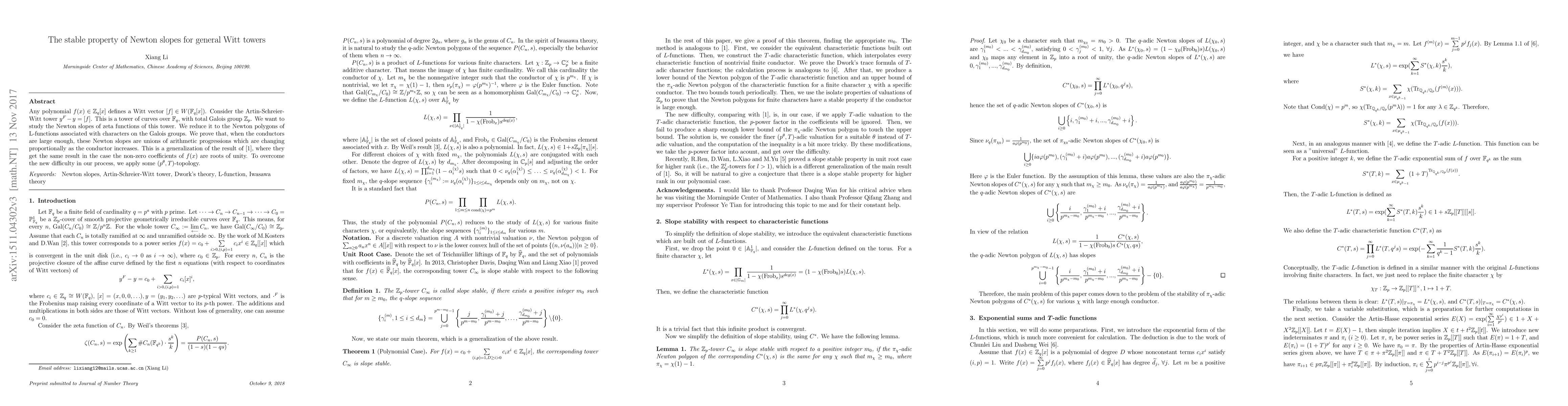 This paper explores the stable properties of Newton slopes for general Witt towers, demonstrating that under large conductors, these slopes form unions of arithmetic progressions that scale proportionally. The study generalizes previous results by applying $(p^{\theta},T)$-topology to overcome new challenges.