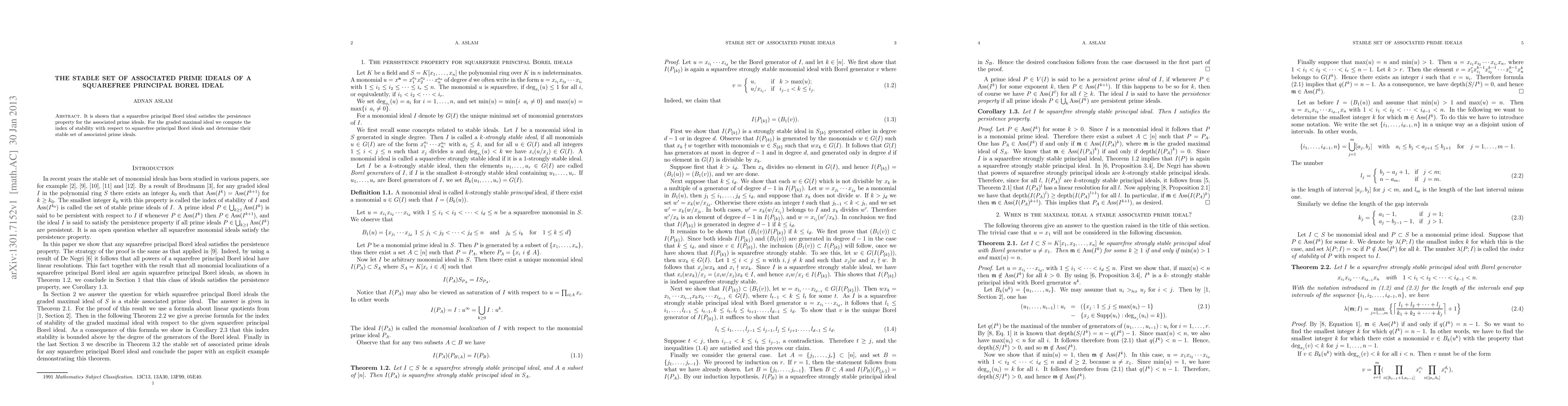 It is shown that a squarefree principal Borel ideal satisfies the persistence property for the associated prime ideals. For the graded maximal ideal we compute the index of stability with respect to squarefree principal Borel ideals and determine their stable set of associated prime ideals.