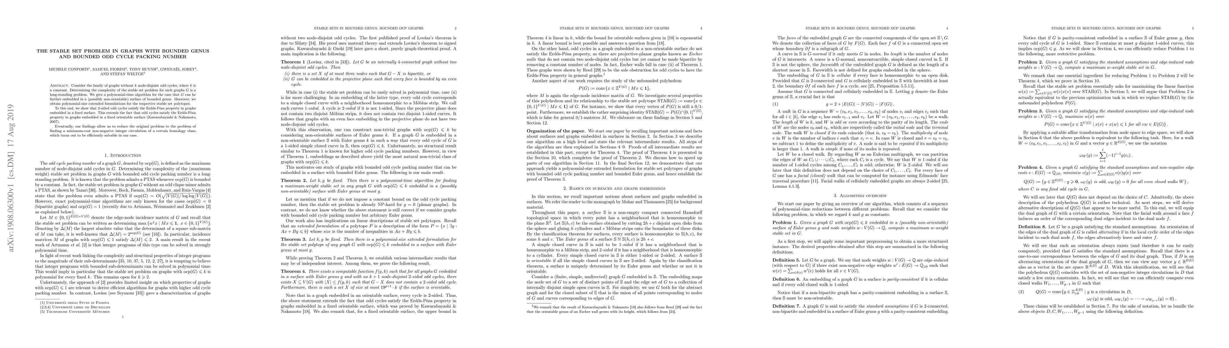 This paper presents a polynomial-time algorithm for solving the stable set problem in graphs with bounded genus and limited odd cycle packing, leveraging the Erdős-Pósa property of $2$-sided odd cycles. It also provides polynomial-size extended formulations for the stable set polytopes and reduces the problem to efficiently solvable circulation problems.