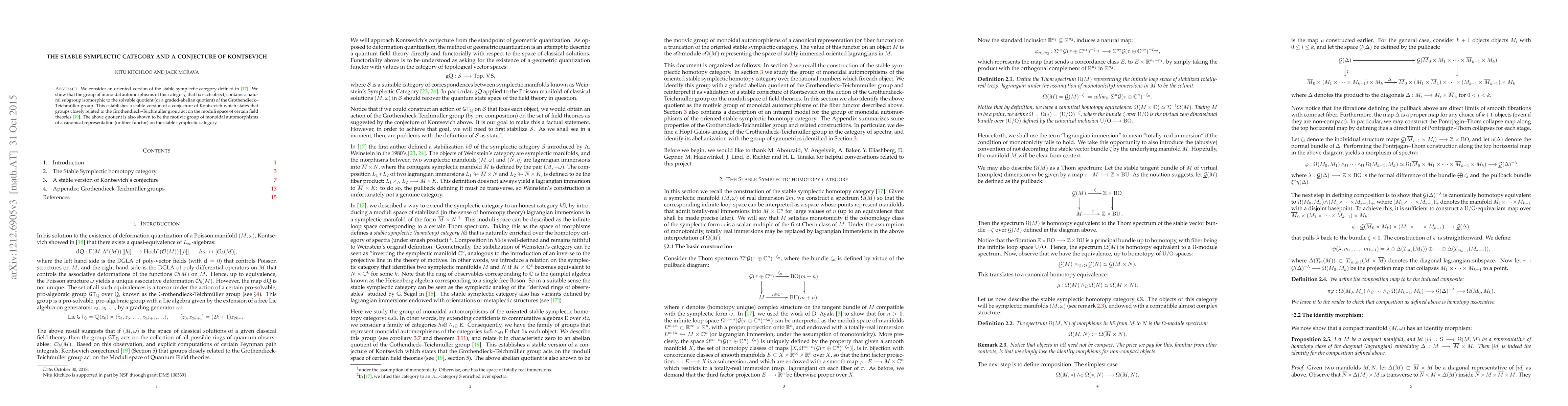 This paper establishes a stable version of Kontsevich's conjecture by demonstrating that the oriented stable symplectic category's monoidal automorphisms contain a subgroup isomorphic to the solvable quotient of the Grothendieck-Teichmüller group, thus linking it to the moduli space of certain field theories.