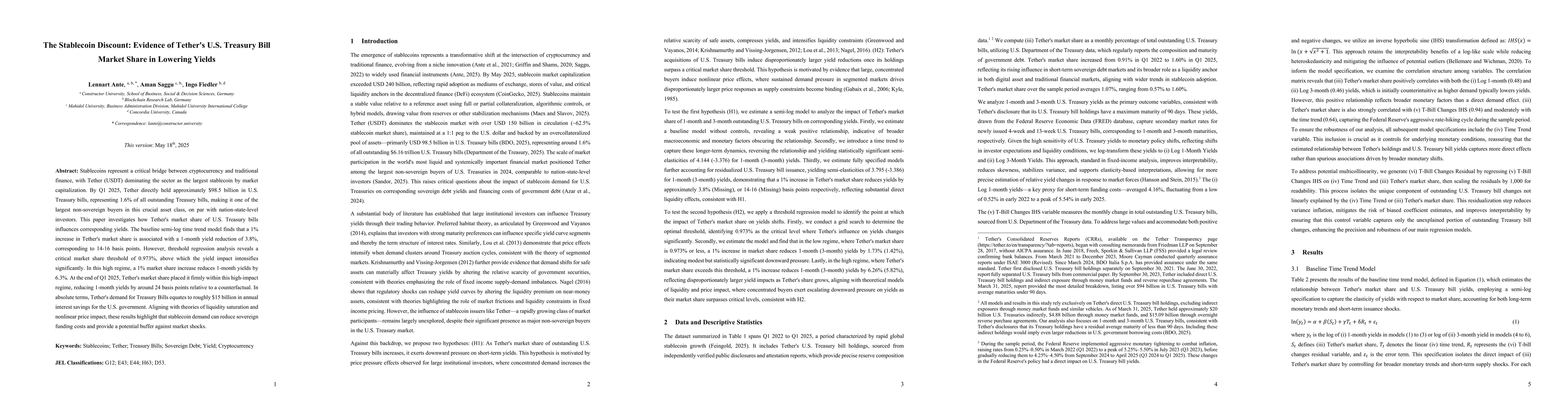 A study finds that Tether's large market share of US Treasury bills leads to lower yields, with a 1% increase in market share reducing 1-month yields by 3.8%, equivalent to 14-16 basis points.