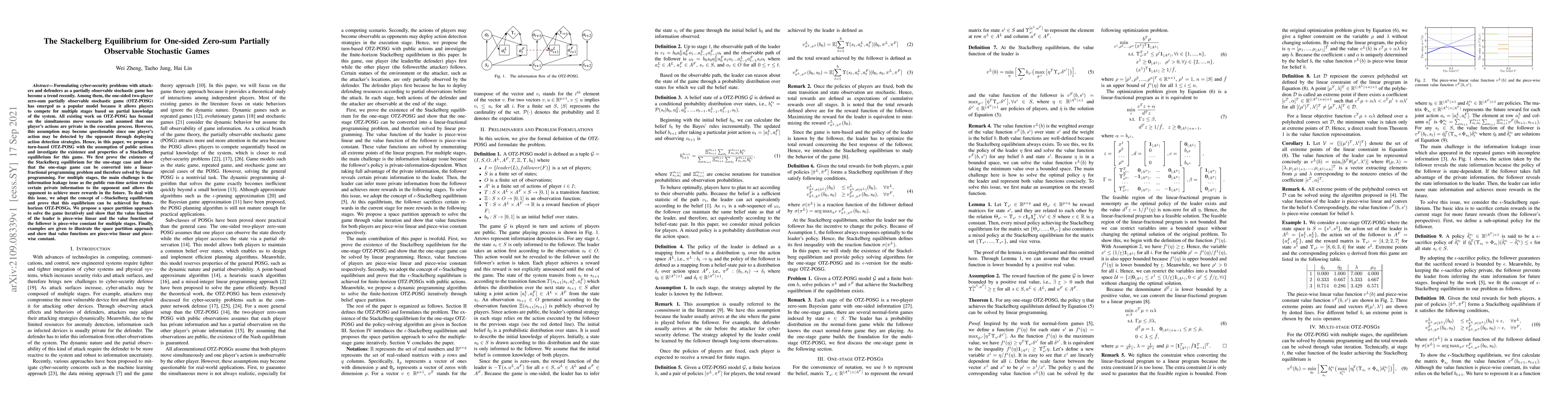 Formulating cyber-security problems with attackers and defenders as a partially observable stochastic game has become a trend recently. Among them, the one-sided two-player zero-sum partially observable stochastic game (OTZ-POSG) has emerged as a popular model because it allows players to compete for multiple stages based on partial knowledge of the system. All existing work on OTZ-POSG has focused on the simultaneous move scenario and assumed that one player's actions are private in the execution process. However, this assumption may become questionable since one player's action may be detected by the opponent through deploying action detection strategies. Hence, in this paper, we propose a turn-based OTZ-POSG with the assumption of public actions and investigate the existence and properties of a Stackelberg equilibrium for this game. We first prove the existence of the Stackelberg equilibrium for the one-stage case and show that the one-stage game can be converted into a linear-fractional programming problem and therefore solved by linear programming. For multiple stages, the main challenge is the information leakage issue as the public run-time action reveals certain private information to the opponent and allows the opponent to achieve more rewards in the future. To deal with this issue, we adopt the concept of $\epsilon$-Stackelberg equilibrium and prove that this equilibrium can be achieved for finite-horizon OTZ-POSGs. We propose a space partition approach to solve the game iteratively and show that the value function of the leader is piece-wise linear and the value function of the follower is piece-wise constant for multiple stages. Finally, examples are given to illustrate the space partition approach and show that value functions are piece-wise linear and piece-wise constant.