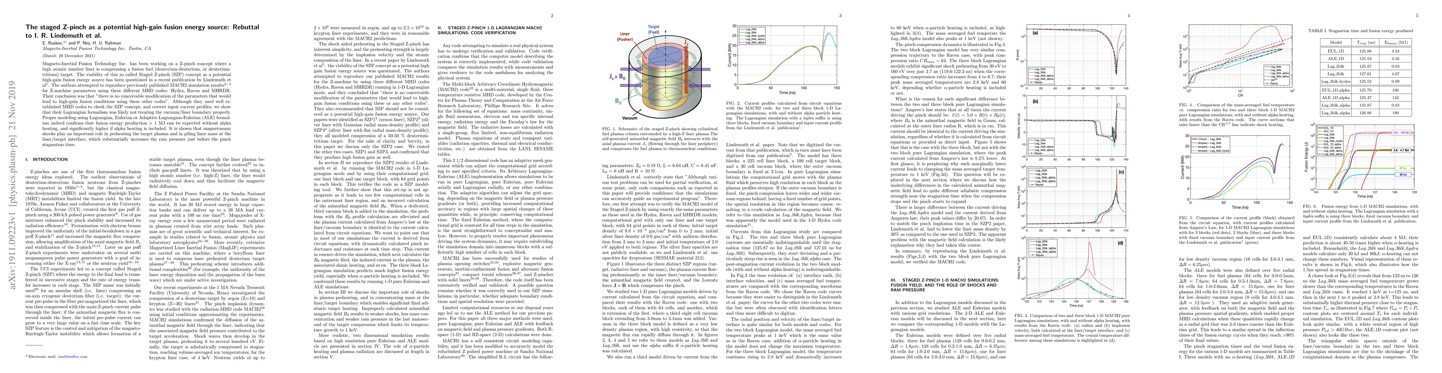 This paper defends the viability of the Staged Z-pinch (SZP) fusion concept against criticisms by Lindemuth et al, arguing that their MHD simulations failed to properly model the vacuum/liner boundary. The authors assert that correct modeling confirms high-gain fusion energy production exceeding 1 MJ, especially with alpha heating, facilitated by magnetosonic shocks preheating the plasma and increasing ram pressure.