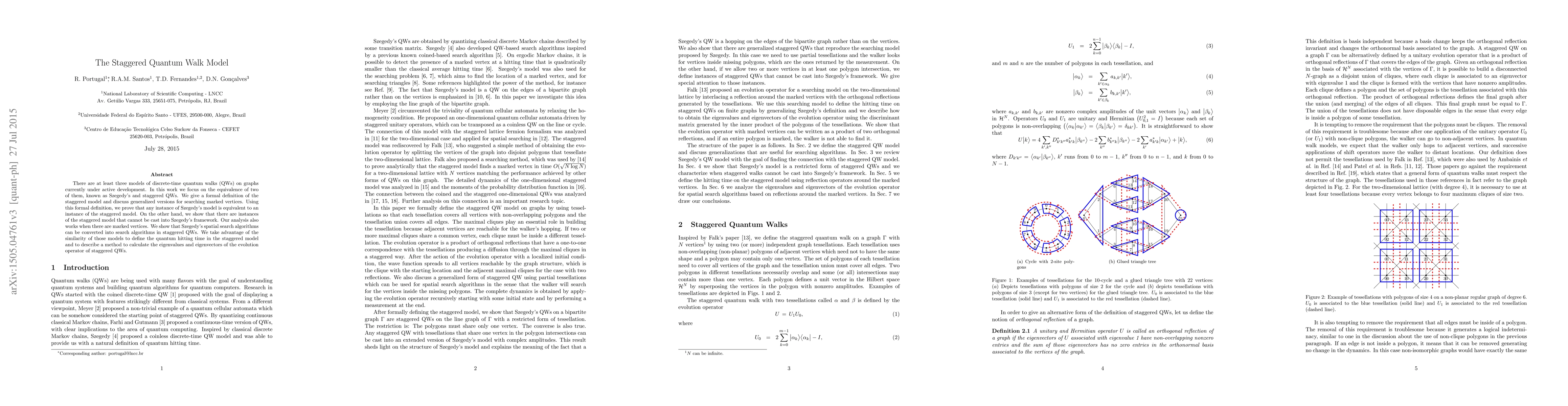 There are at least three models of discrete-time quantum walks (QWs) on graphs currently under active development. In this work we focus on the equivalence of two of them, known as Szegedy's and staggered QWs. We give a formal definition of the staggered model and discuss generalized versions for searching marked vertices. Using this formal definition, we prove that any instance of Szegedy's model is equivalent to an instance of the staggered model. On the other hand, we show that there are instances of the staggered model that cannot be cast into Szegedy's framework. Our analysis also works when there are marked vertices. We show that Szegedy's spatial search algorithms can be converted into search algorithms in staggered QWs. We take advantage of the similarity of those models to define the quantum hitting time in the staggered model and to describe a method to calculate the eigenvalues and eigenvectors of the evolution operator of staggered QWs.
