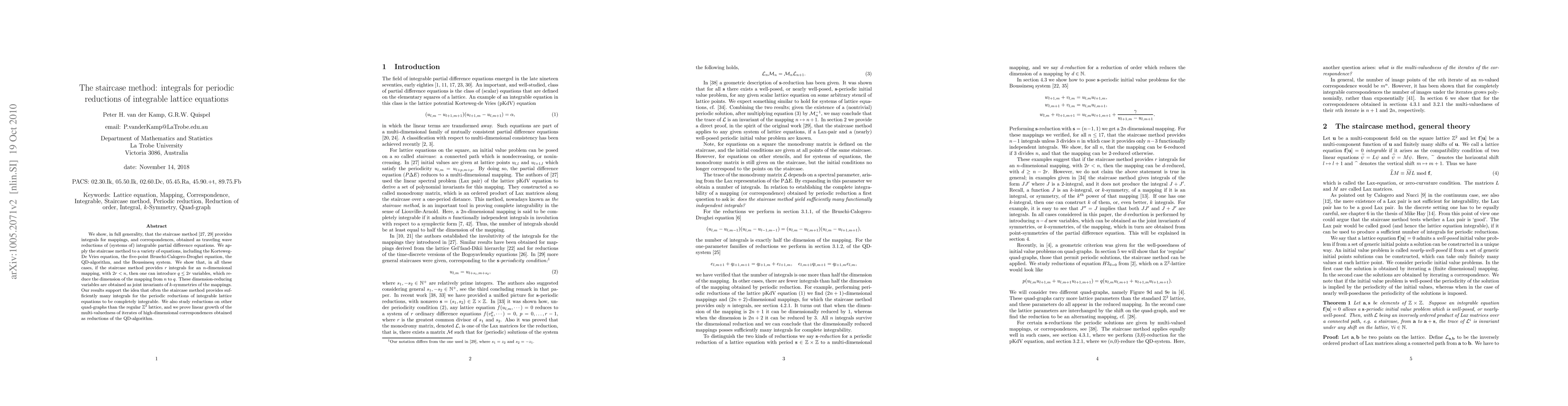 The staircase method is shown to provide integrals for traveling wave reductions of integrable lattice equations, including the Korteweg-De Vries equation and the Boussinesq system. It demonstrates the potential for complete integrability in periodic reductions by introducing dimension-reducing variables as joint invariants of k-symmetries.