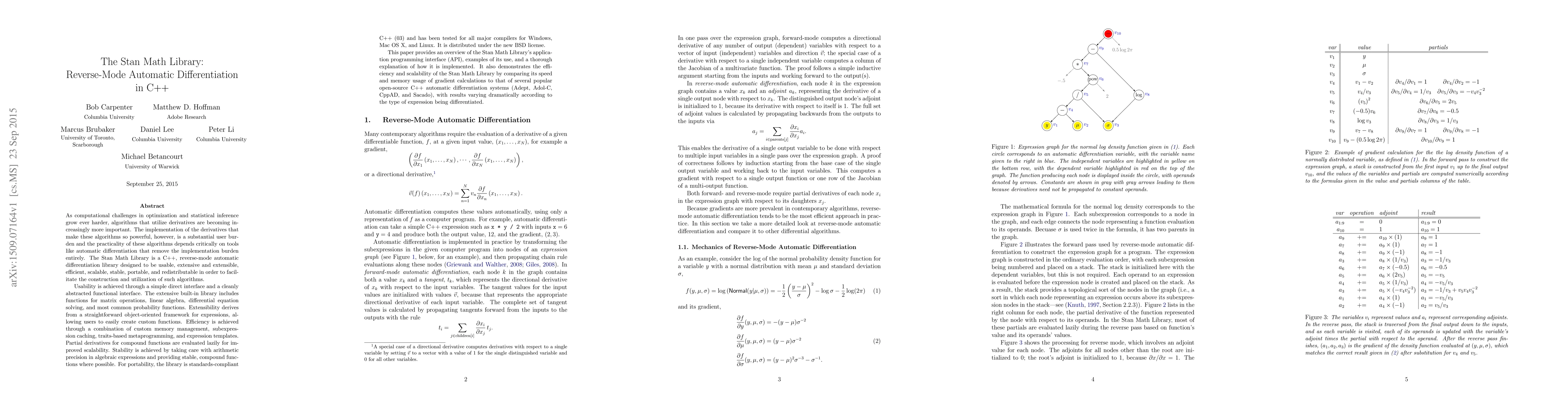 The Stan Math Library is a C++ reverse-mode automatic differentiation library designed for usability, extensibility, and efficiency, featuring a straightforward interface, extensive built-in functions, and custom memory management for scalability and stability. It supports matrix operations, linear algebra, differential equations, and probability functions, with a focus on being standards-compliant and portable across major operating systems.