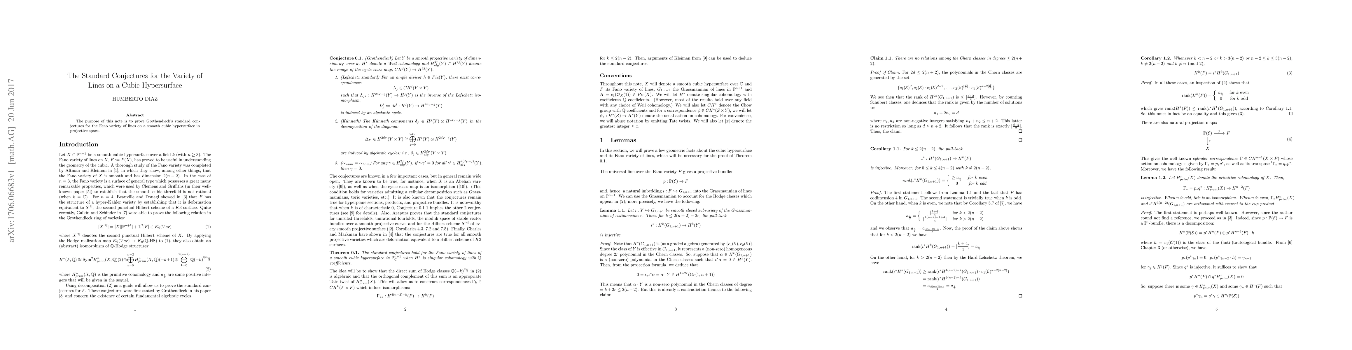 Summary: This paper proves Grothendieck's standard conjectures for the Fano variety of lines on a smooth cubic hypersurface in projective space, establishing significant results in algebraic geometry. The findings contribute to the broader understanding of the relationship between geometry and cohomology.