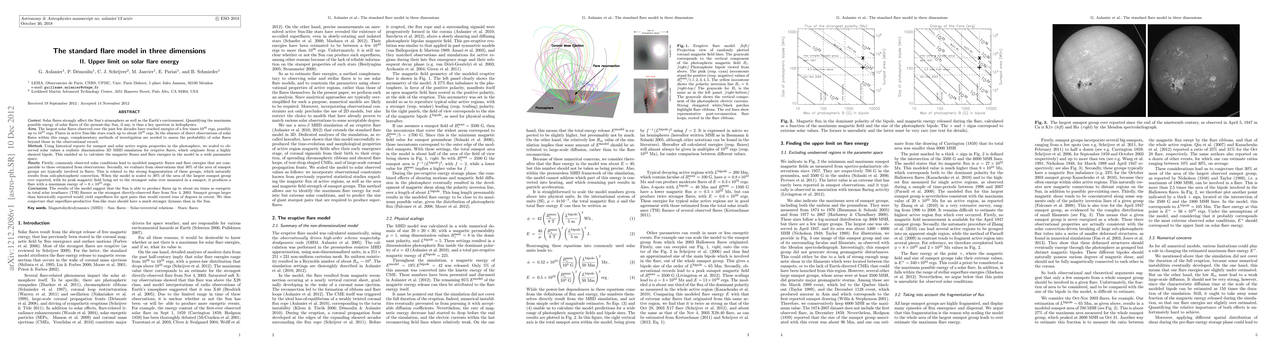 Solar flares strongly affect the Sun's atmosphere as well as the Earth's environment. Quantifying the maximum possible energy of solar flares of the present-day Sun, if any, is thus a key question in heliophysics. The largest solar flares observed over the past few decades have reached energies of a few times 10^{32} ergs, possibly up to 10^{33} ergs. Flares in active Sun-like stars reach up to about 10^{36} ergs. In the absence of direct observations of solar flares within this range, complementary methods of investigation are needed. Using historical reports for solar active region, we scaled to observed solar values a realistic dimensionless 3D MHD simulation for eruptive flares, which originate from a highly sheared bipole. This enabled us to calculate the magnetic fluxes and flare energies in the model in a wide paramater space. Firstly, commonly observed solar conditions lead to modeled magnetic fluxes and flare energies that are comparable to those estimated from observations. Secondly, we evaluate from observations that 30% of the area of sunspot groups are typically involved in flares. This is related to the strong fragmentation of these groups, which naturally results from sub-photospheric convection. When the model is scaled to 30% of the area of the largest sunspot group ever reported, with its peak magnetic field being set to the strongest value ever measured in a sunspot, it produces a flare with a maximum energy of ~ 6x10^{33} ergs. The results of the model suggest that the Sun is able to produce flares up to about six times as energetic in total solar irradiance fluence as the strongest directly-observed flare from Nov 4, 2003. Sunspot groups larger than historically reported would yield superflares for spot pairs that would exceed tens of degrees in extent. We thus conjecture that superflare-productive Sun-like stars should have a much stronger dynamo than in the Sun.