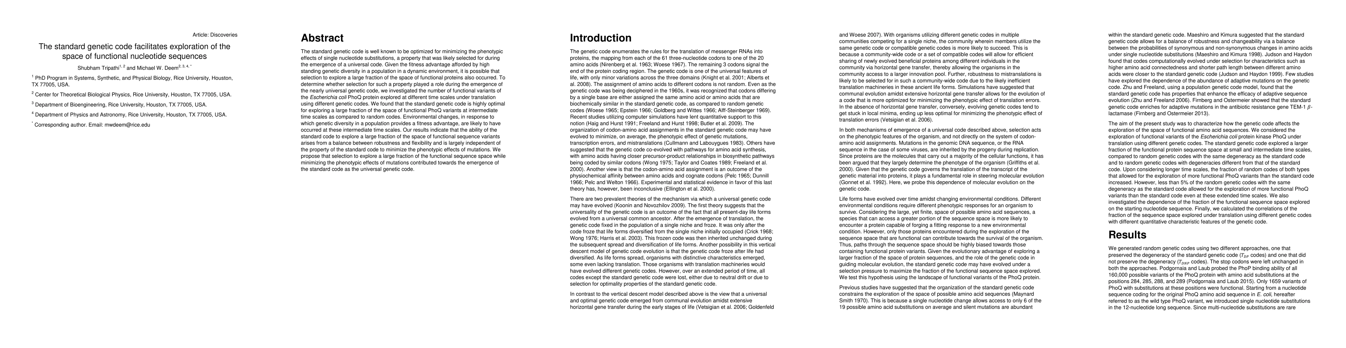 The standard genetic code optimizes exploration of functional protein variants, balancing robustness and flexibility, which may have been selected for during the emergence of the universal code to enhance adaptability in dynamic environments. This exploration ability is largely independent of the code's minimization of mutation effects.