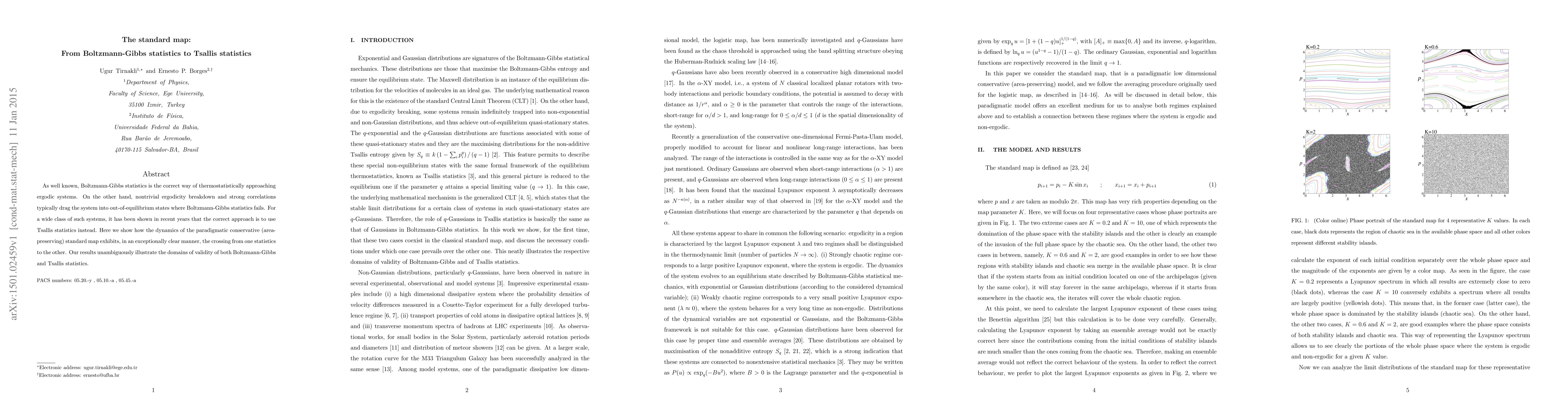 This paper investigates the dynamics of the standard map, demonstrating how it transitions from Boltzmann-Gibbs statistics to Tsallis statistics under conditions of ergodicity breakdown and strong correlations, thereby illustrating the domains of validity for both statistical frameworks.