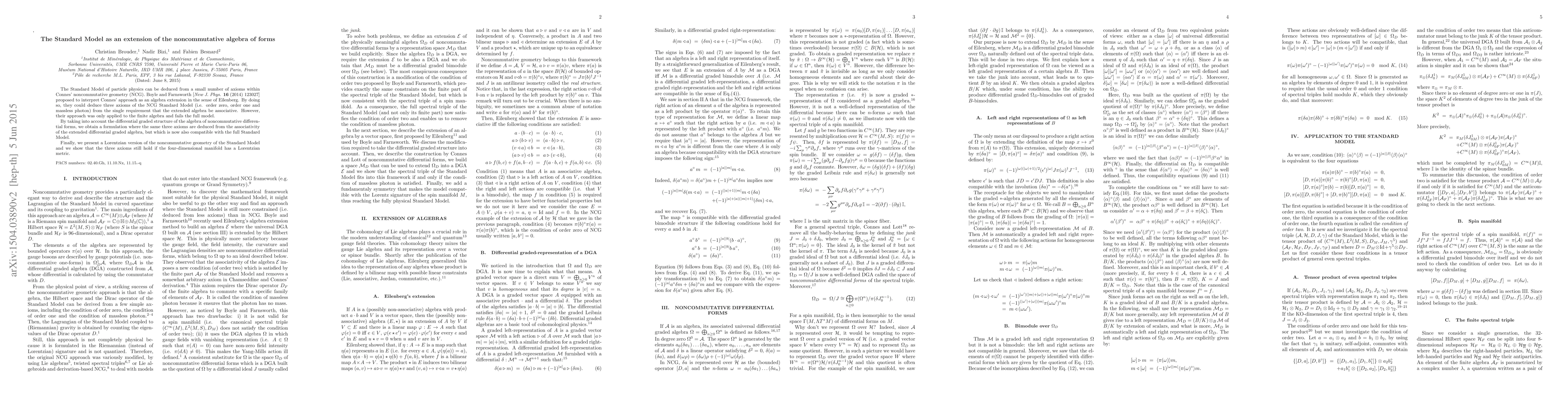This paper deduces the Standard Model of particle physics from the associativity of an extended differential graded algebra of noncommutative forms within Connes' noncommutative geometry, successfully applying the approach to the full model and presenting a Lorentzian version that maintains the model's axioms.