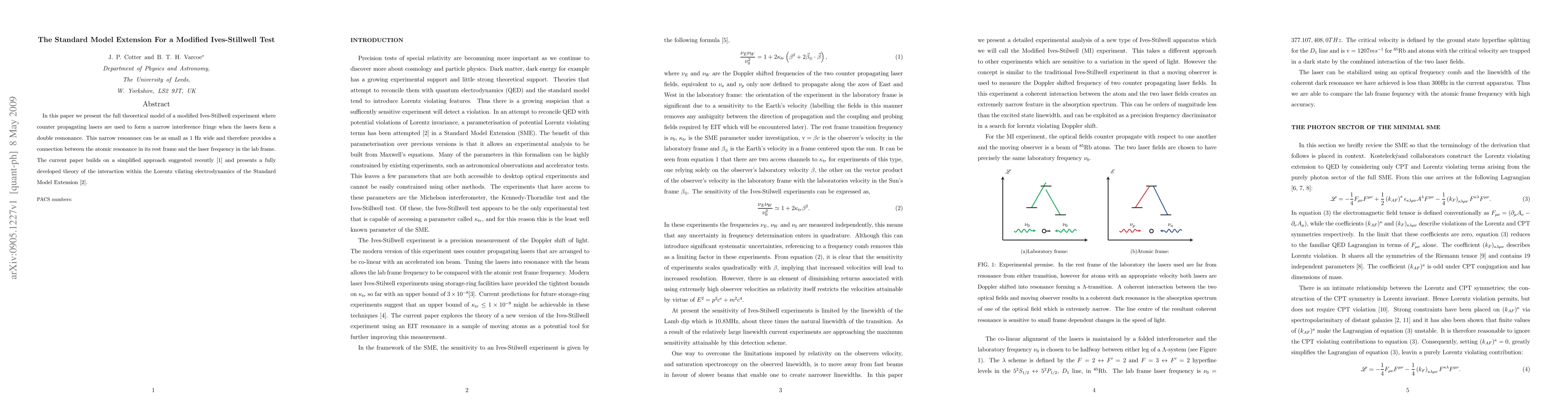 In this paper we present the full theoretical model of a modified Ives-Stillwell experiment where counter propagating lasers are used to form a narrow interference fringe when the lasers form a double resnonance. This narrow resoannce can be as small as 1 Hz wide and therefore provides a connection between the atomic resonance in its rest frame and the laser frequency in the lab frame. The current paper builds on a simplified approach suggested recently and presents a fully developed theory of the interaction within the Lorentz vilating electrodynamics of the Standard Model Extension.