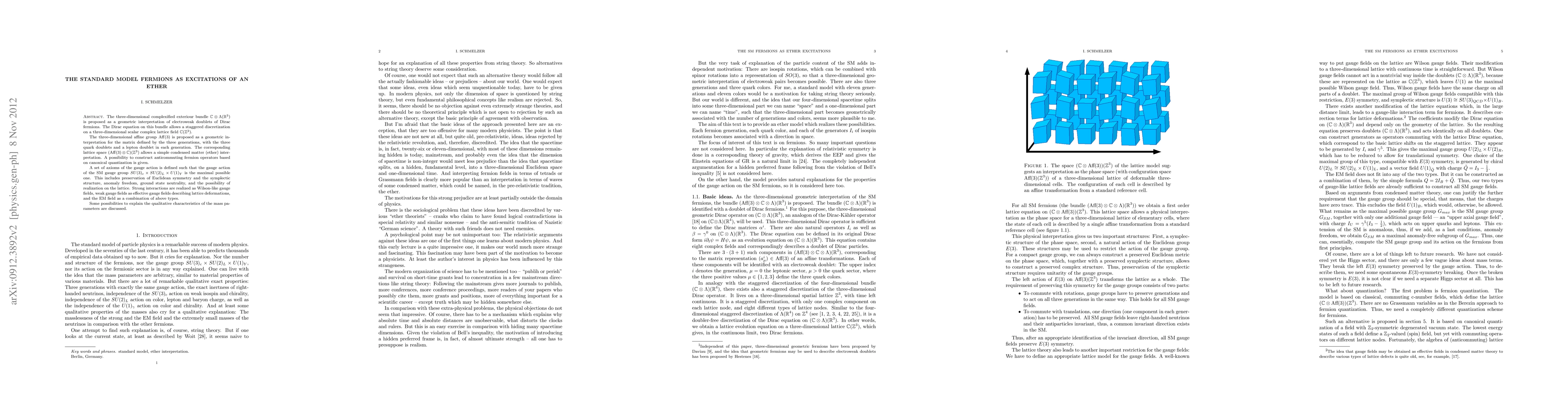 The three-dimensional complexified exteriour bundle $C \otimes \Lambda(R^3)$ is proposed as a geometric interpretation of electroweak doublets of Dirac fermions. The Dirac equation on this bundle allows a staggered discretization on a three-dimensional scalar complex lattice field $C(Z^3)$. The three-dimensional affine group $Aff(3)$ is proposed as a geometric interpretation for the matrix defined by the three generations, with the three quark doublets and a lepton doublet in each generation. The corresponding lattice space $(Aff(3) \otimes C)(Z^3)$ allows a simple condensed matter (ether) interpretation. A possibility to construct anticommuting fermion operators based on canonical quantization is given. A set of axioms of the gauge action is defined such that the gauge action of the SM gauge group $SU(3)_c x SU(2)_L x U(1)_{Y}$ is the maximal possible one. This includes preservation of Euclidean symmetry and the symplectic structure, anomaly freedom, ground state neutrality, and the possibility of realization on the lattice. Strong interactions are realized as Wilson-like gauge fields, weak gauge fields as effective gauge fields describing lattice deformations, and the EM field as a combination of above types. Some possibilities to explain the qualitative characteristics of the mass parameters are discussed.
