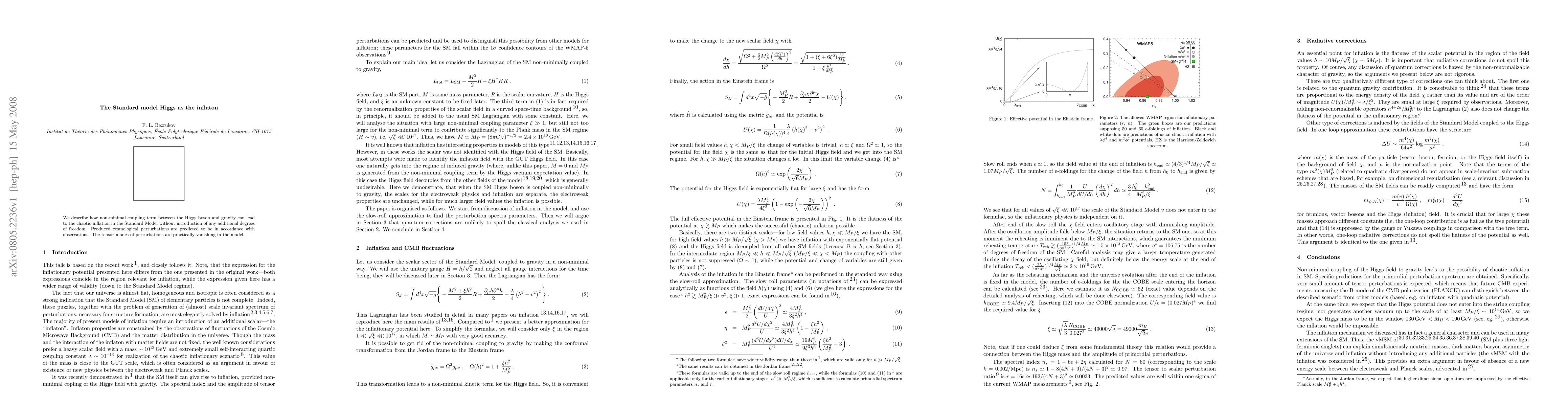 This paper proposes that the Standard Model Higgs boson can serve as the inflaton in chaotic inflation through a non-minimal coupling with gravity, without requiring extra fields. The model predicts cosmological perturbations consistent with observations, with negligible tensor modes.