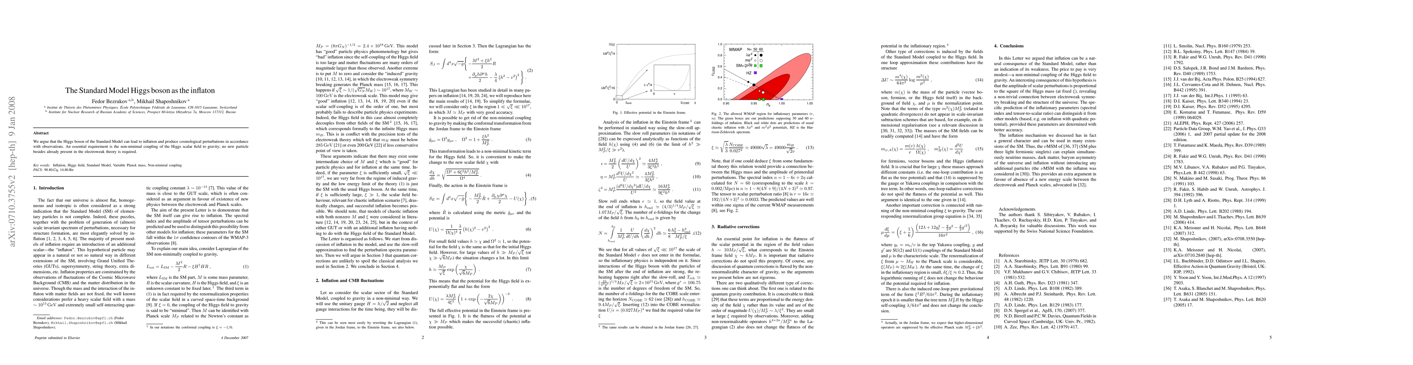 Summary: This paper proposes that the Standard Model Higgs boson can serve as the inflaton driving cosmic inflation, relying on its non-minimal coupling to gravity without introducing new particles beyond the electroweak theory, thus aligning with observational data.
