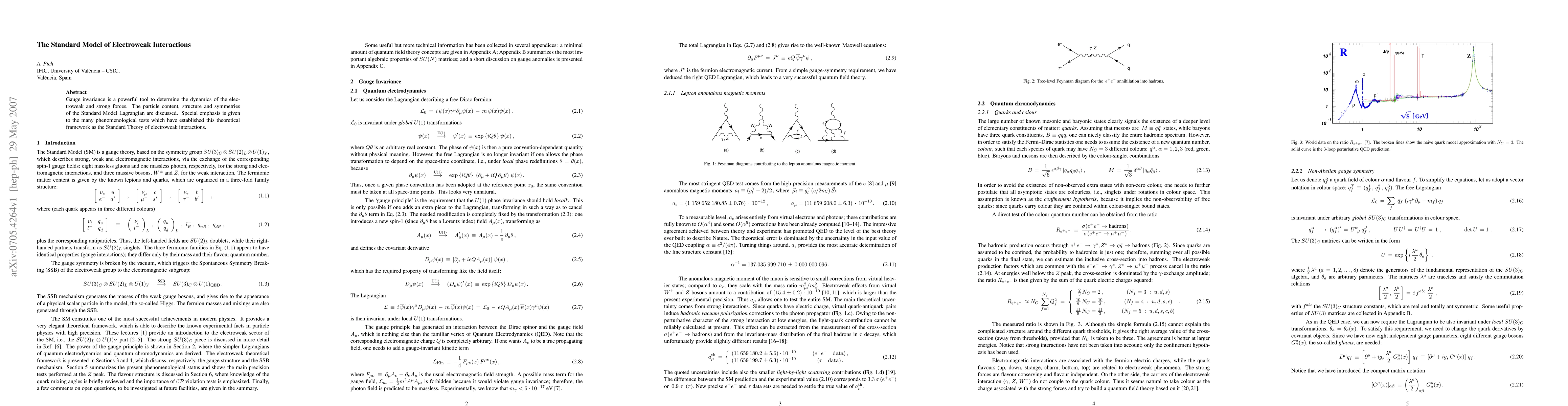 The paper explores the use of gauge invariance in defining the dynamics of electroweak and strong forces. It details the Standard Model Lagrangian's particle content, structure, and symmetries, highlighting numerous experiments that validate this framework.