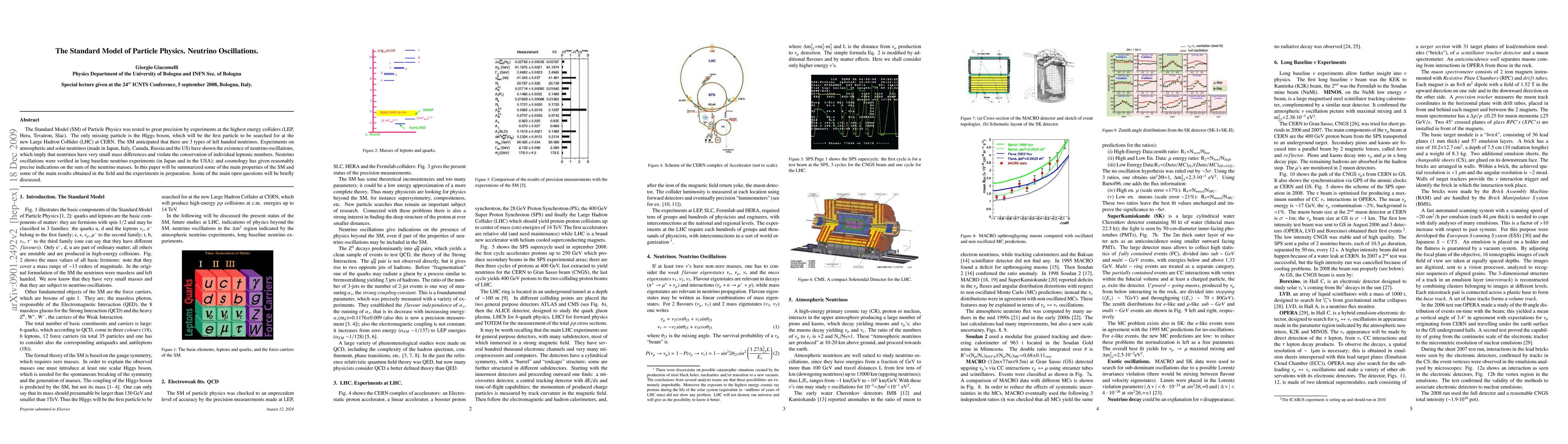 The Standard Model (SM) of Particle Physics was tested to great precision by experiments at the highest energy colliders (LEP, Hera, Tevatron, SLAC). The only missing particle is the Higgs boson, which will be the first particle to be searched for at the new Large Hadron Collider (LHC) at CERN. The SM anticipated that there are 3 types of left handed neutrinos. Experiments on atmospheric and solar neutrinos (made in Japan, Italy, Canada, Russia and the US) have shown the existence of neutrino oscillations, which imply that neutrinos have very small mass differences and violate the conservation of individual leptonic numbers. Neutrino oscillations were verified in long baseline neutrino experiments (in Japan and in the USA); and cosmology has given reasonably precise indications on the sum of the neutrino masses. In this general lecture will be summarized some of the main properties of the SM and some of the main results obtained in the field and the experiments in preparation. Some of the main open questions will be briefly discussed.