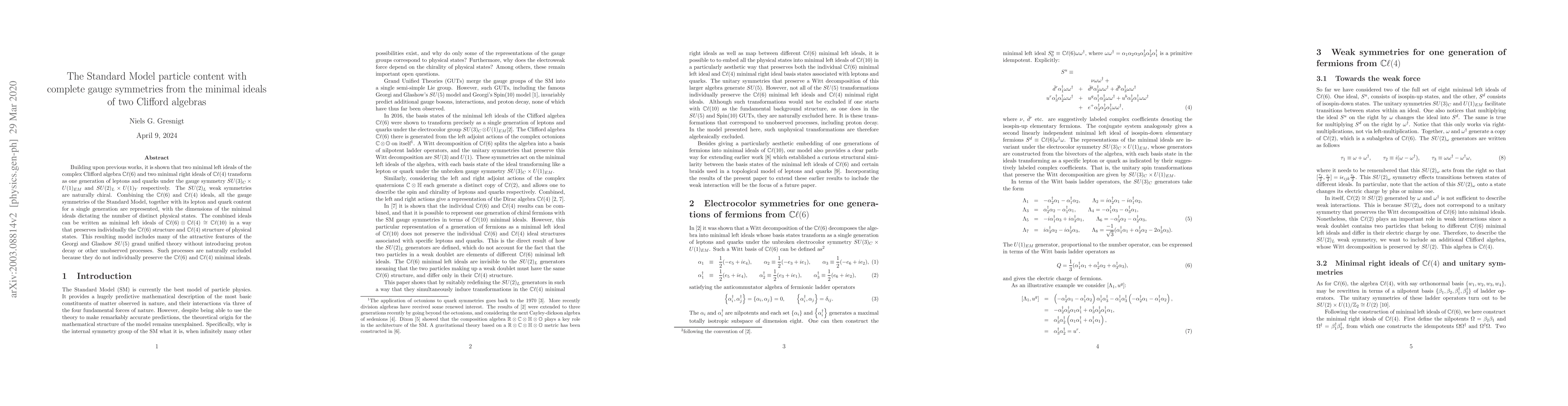 Building upon previous works, it is shown that two minimal left ideals of the complex Clifford algebra $\mathbb{C}\ell(6)$ and two minimal right ideals of $\mathbb{C}\ell(4)$ transform as one generation of leptons and quarks under the gauge symmetry $SU(3)_C\times U(1)_{EM}$ and $SU(2)_L\times U(1)_Y$ respectively. The $SU(2)_L$ weak symmetries are naturally chiral. Combining the $\mathbb{C}\ell(6)$ and $\mathbb{C}\ell(4)$ ideals, all the gauge symmetries of the Standard Model, together with its lepton and quark content for a single generation are represented, with the dimensions of the minimal ideals dictating the number of distinct physical states. The combined ideals can be written as minimal left ideals of $\mathbb{C}\ell(6)\otimes\mathbb{C}\ell(4)\cong \mathbb{C}\ell(10)$ in a way that preserves individually the $\mathbb{C}\ell(6)$ structure and $\mathbb{C}\ell(4)$ structure of physical states. This resulting model includes many of the attractive features of the Georgi and Glashow $SU(5)$ grand unified theory without introducing proton decay or other unobserved processes. Such processes are naturally excluded because they do not individually preserve the $\mathbb{C}\ell(6)$ and $\mathbb{C}\ell(4)$ minimal ideals.