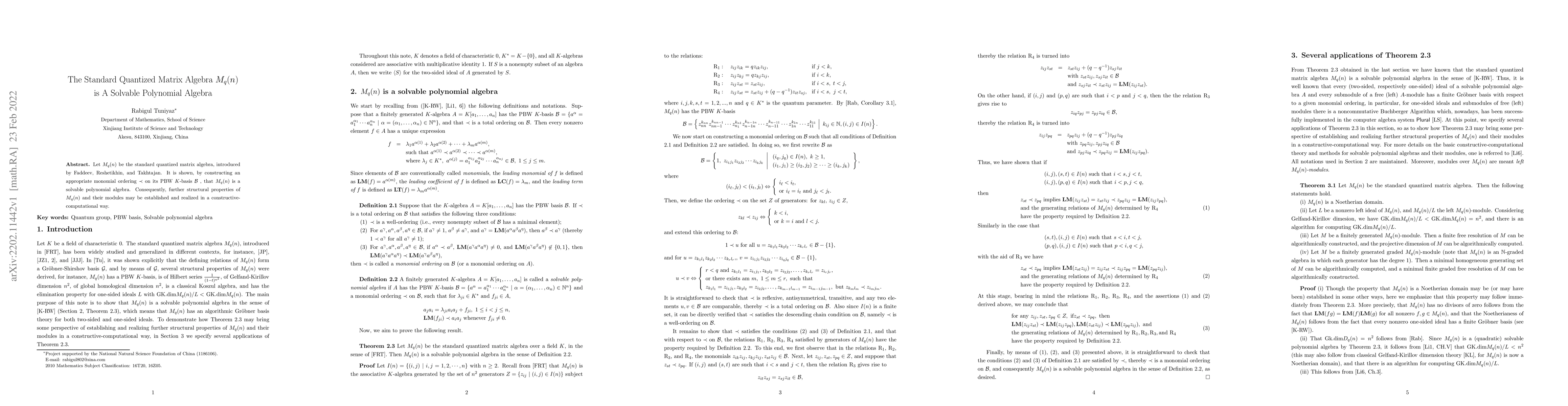 Let $M_q(n)$ be the standard quantized matrix algebra, introduced by Faddeev, Reshetikhin, and Takhtajan. It is shown, by constructing an appropriate monomial ordering $\prec$ on its PBW $K$-basis ${\cal B}$ , that $M_q(n)$ is a solvable polynomial algebra. Consequently, further structural properties of $M_q(n)$ and their modules may be established and realized in a constructive-computational way.