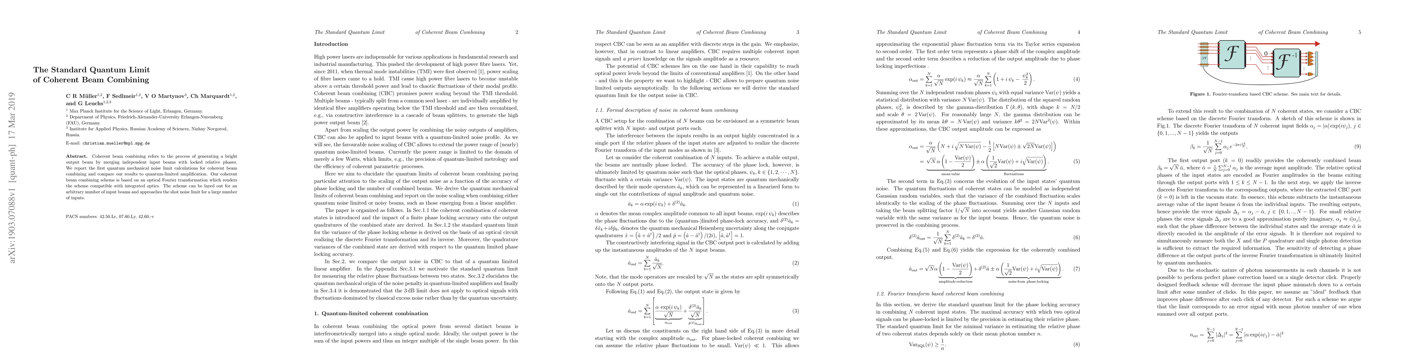 The paper reports the first quantum mechanical noise limit calculations for coherent beam combining, which merges independent input beams to generate a bright output, and compares these limits with quantum-limited amplification. The proposed scheme uses an optical Fourier transformation compatible with integrated optics and approaches the shot noise limit with many input beams.