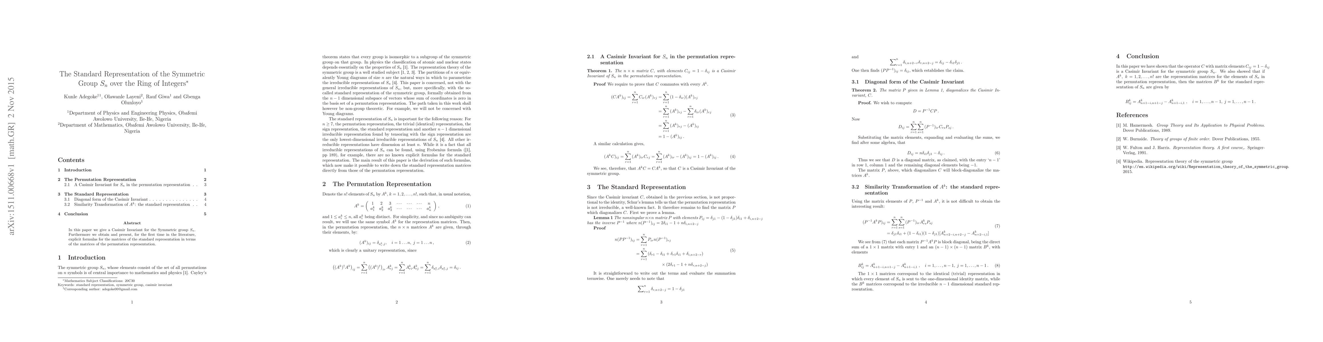 This paper introduces a Casimir Invariant for the Symmetric group $S_n$ and provides, for the first time, explicit formulas relating the matrices of the standard representation to those of the permutation representation over the ring of integers.